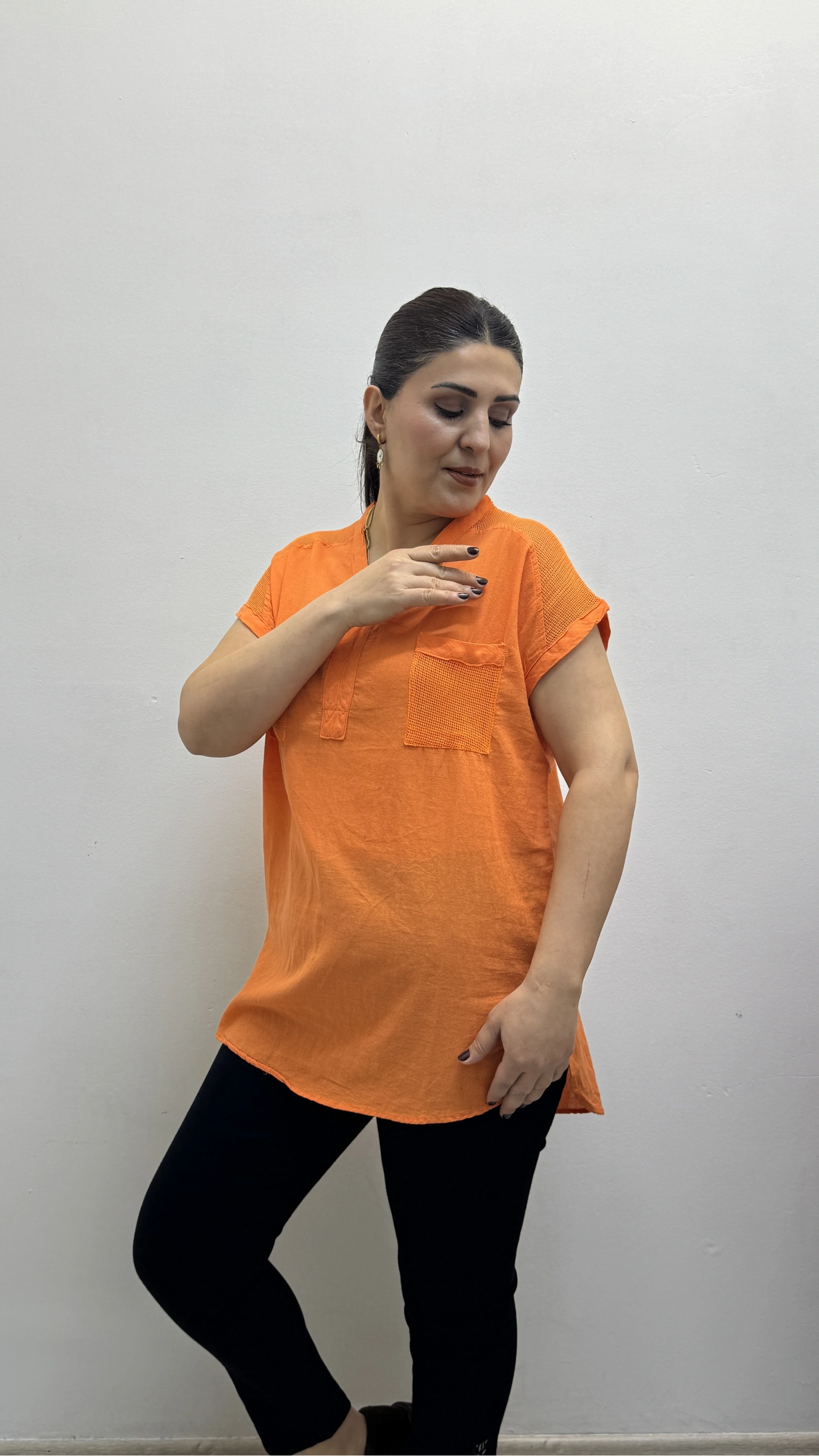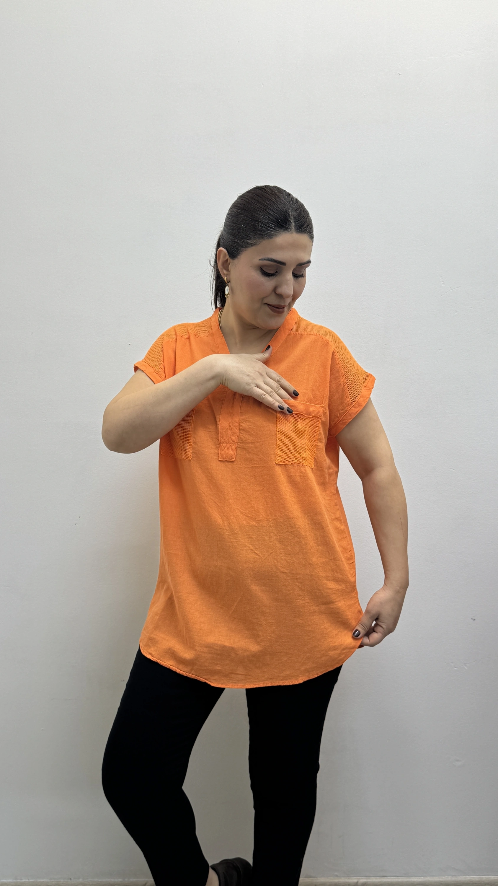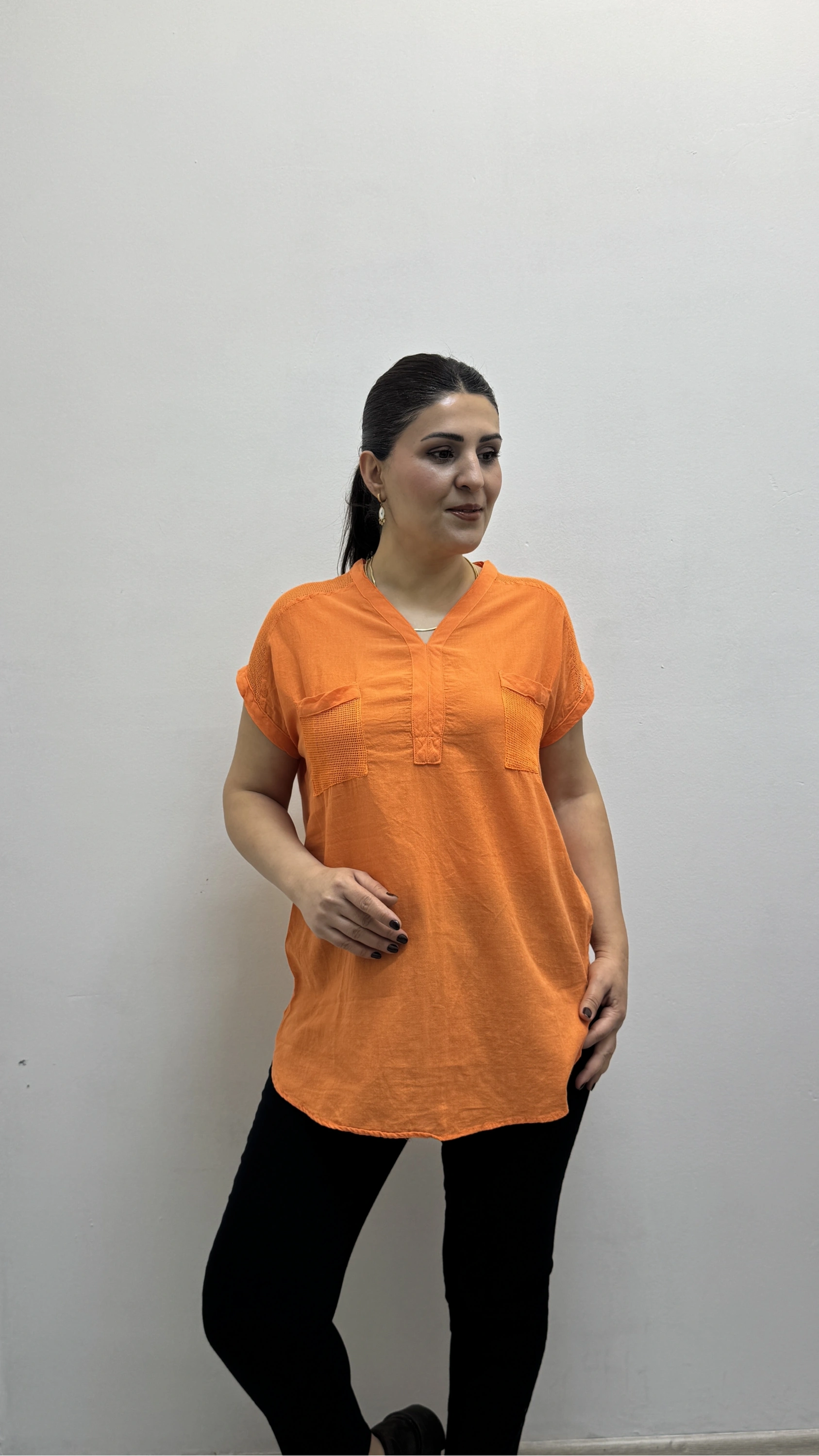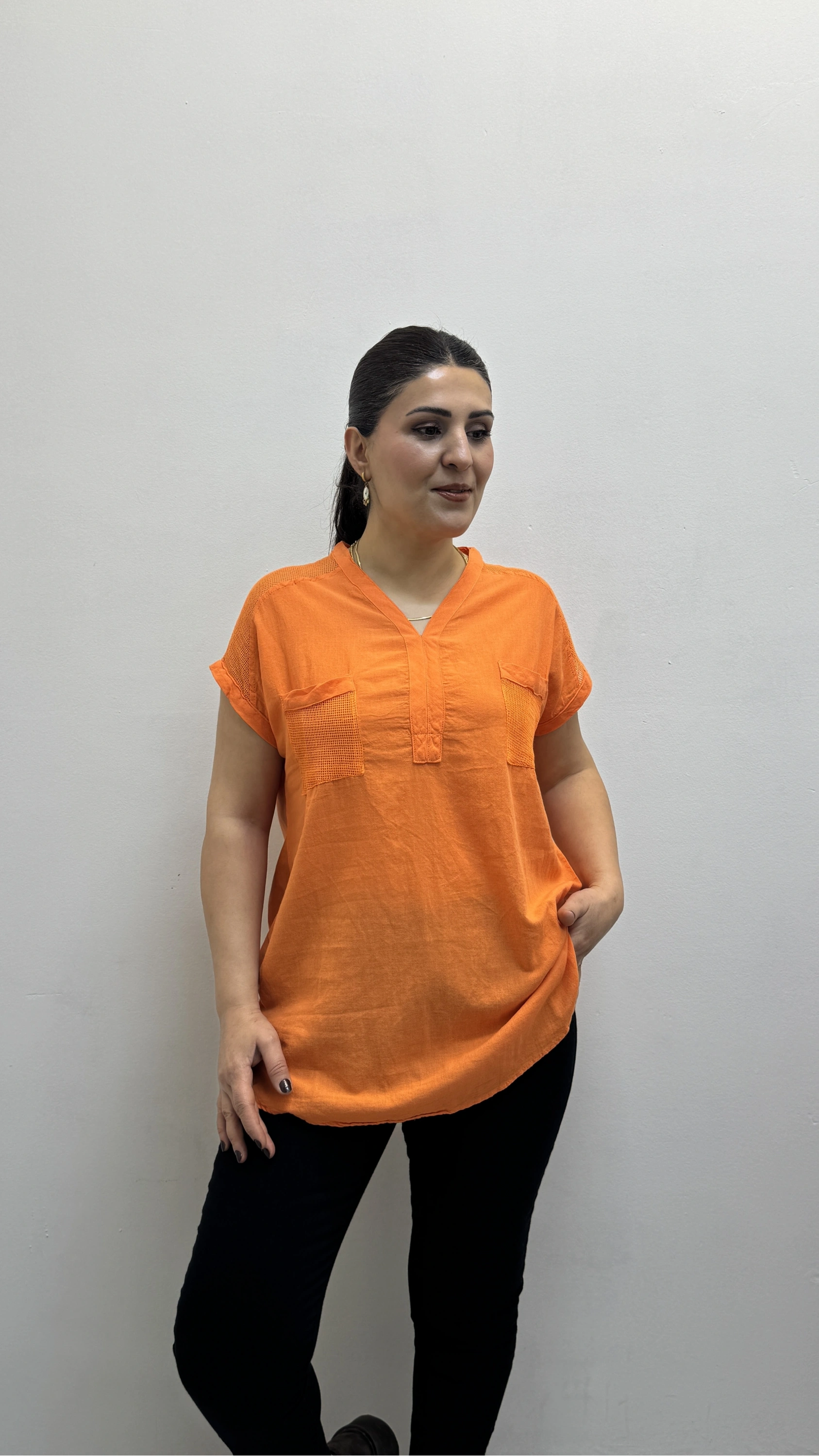 Omuz File Detaylı File Cepli Turuncu Pamuklu Bluz Hakkında