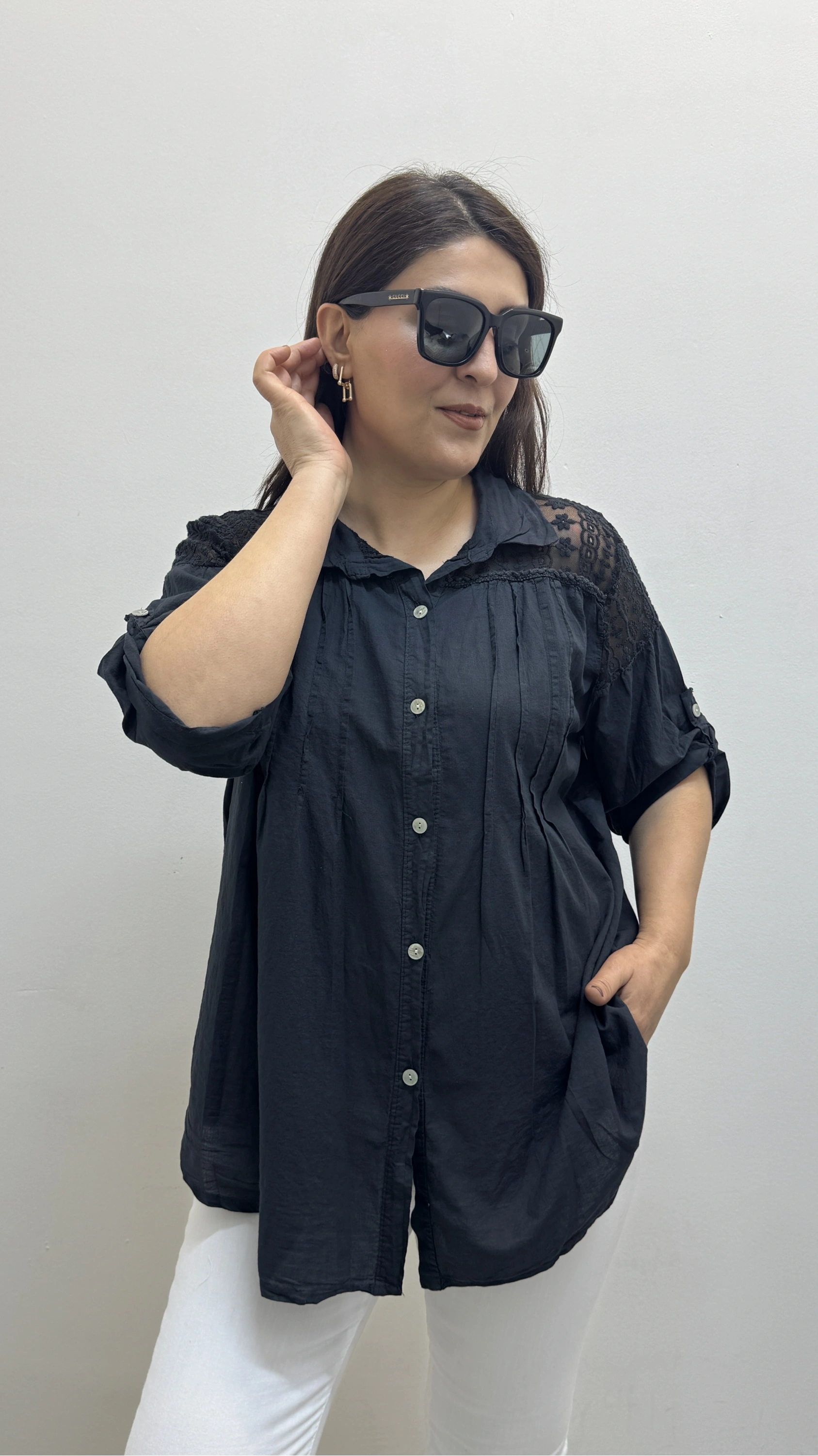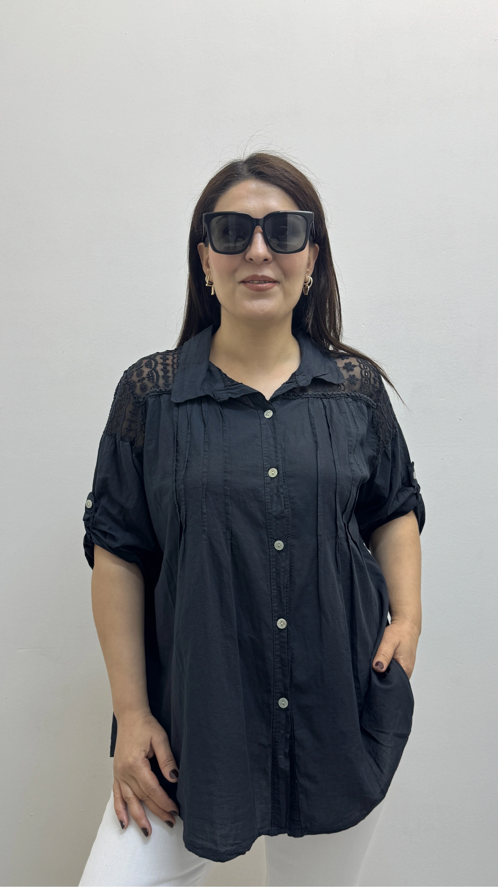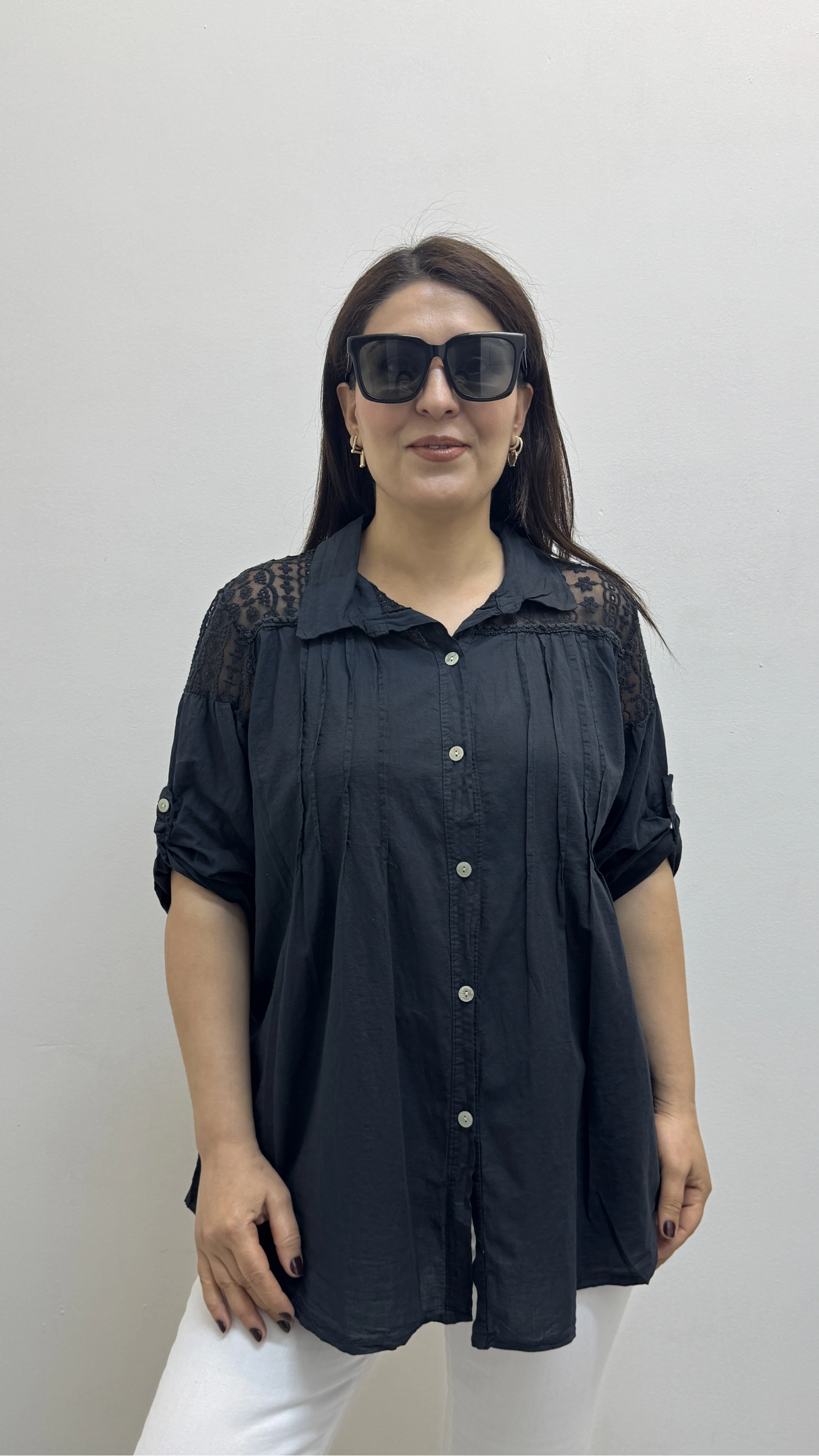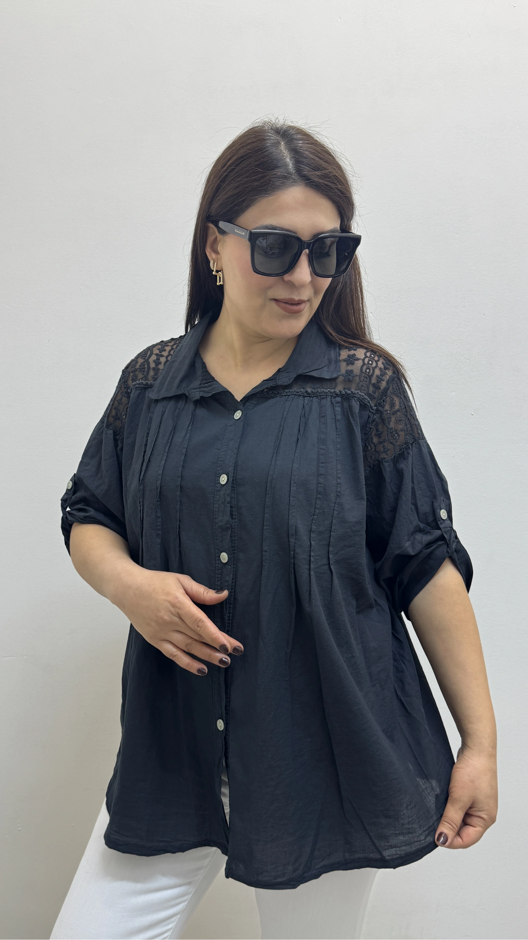 Omuz Tül Ve Dantel Detaylı Pile Dikişli Siyah Renk İthal Gömlek Hakkında