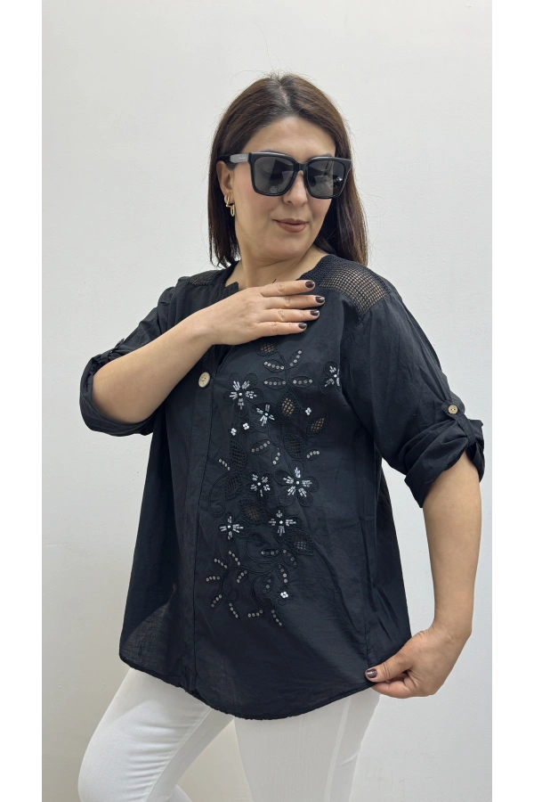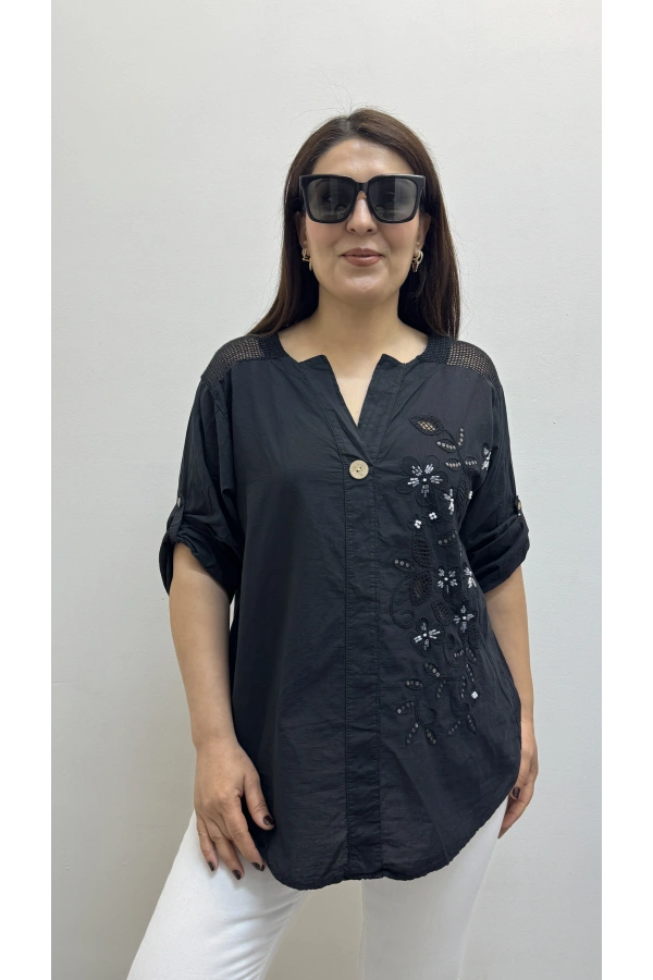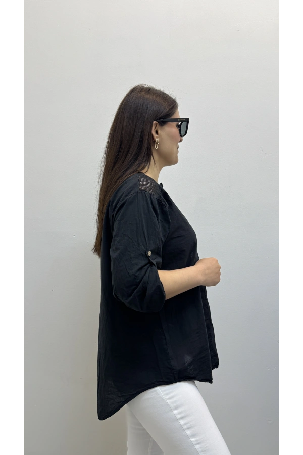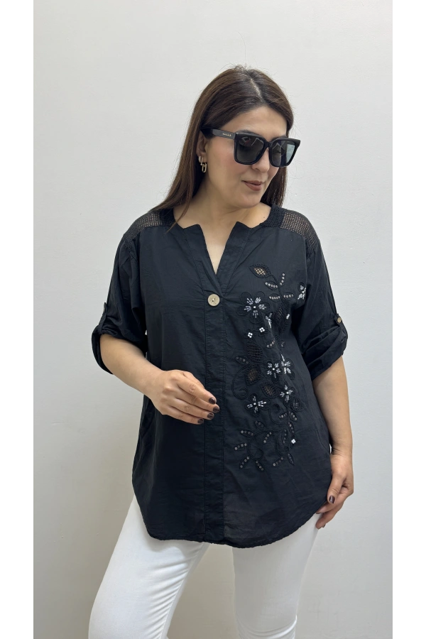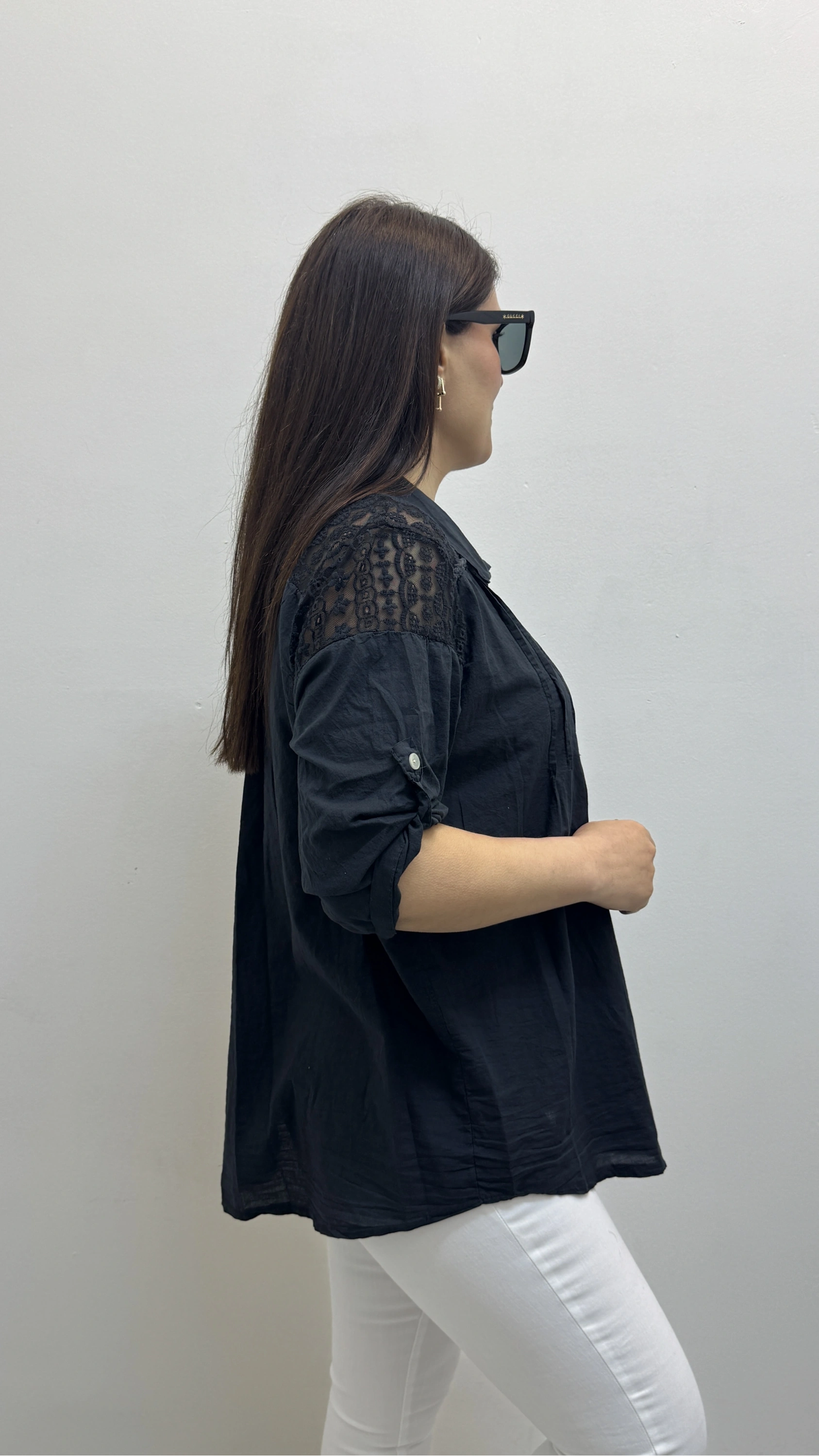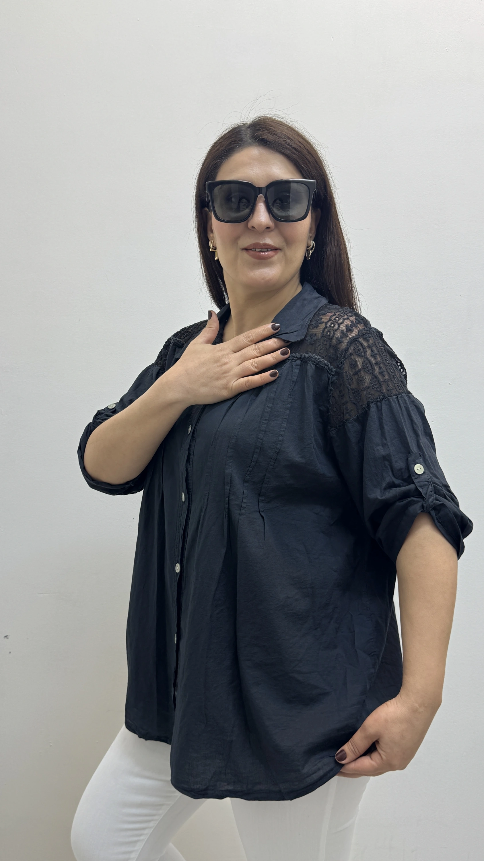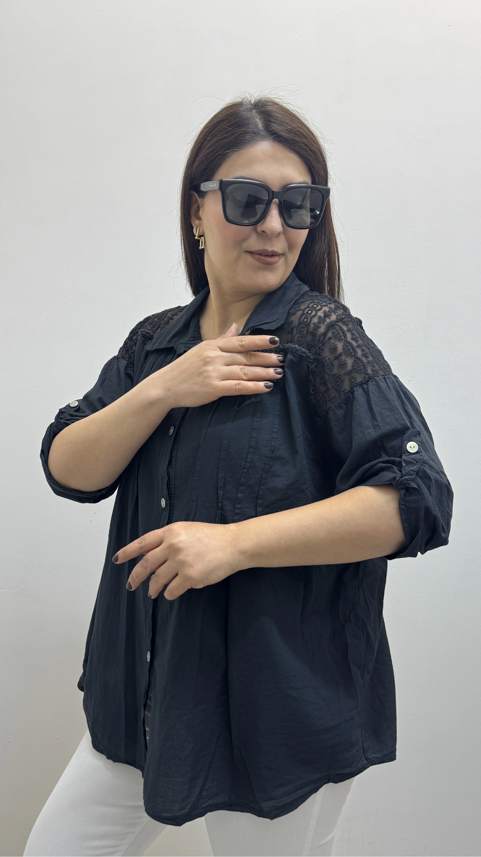 Omuz Tül Ve Dantel Detaylı Pile Dikişli Siyah Renk İthal Gömlek Hakkında