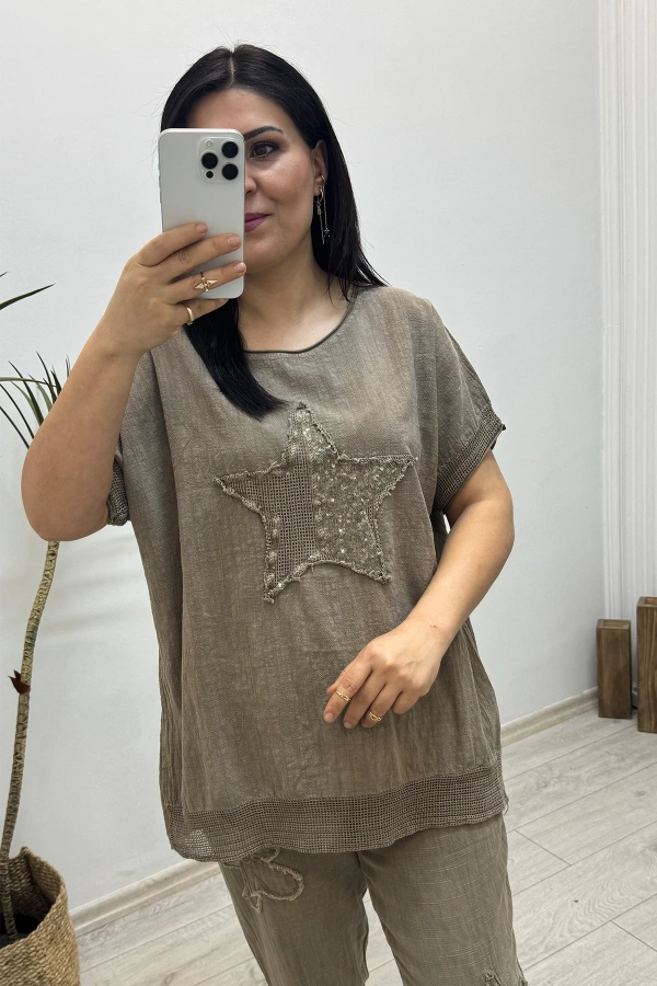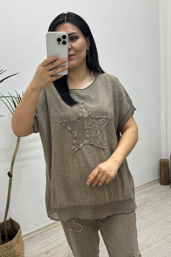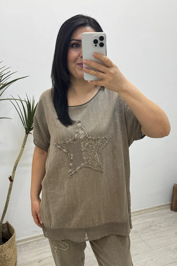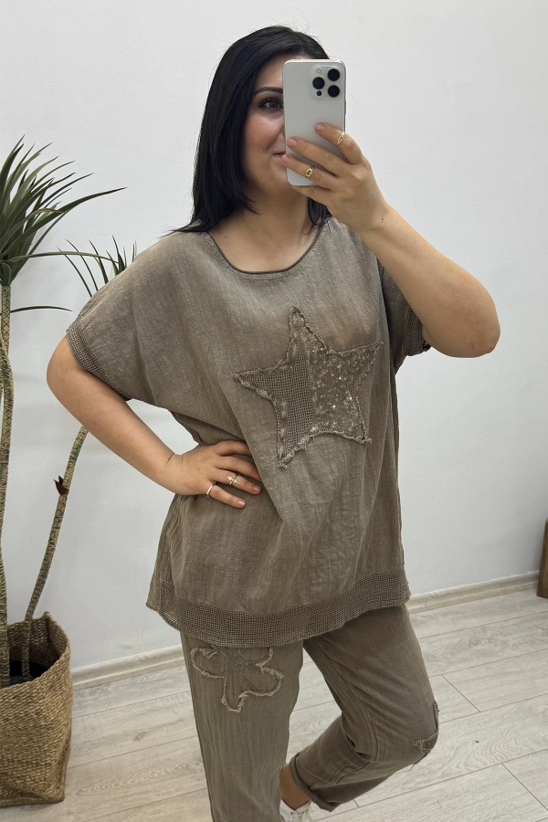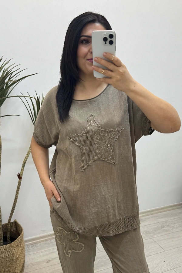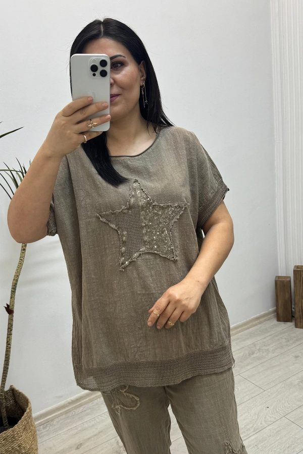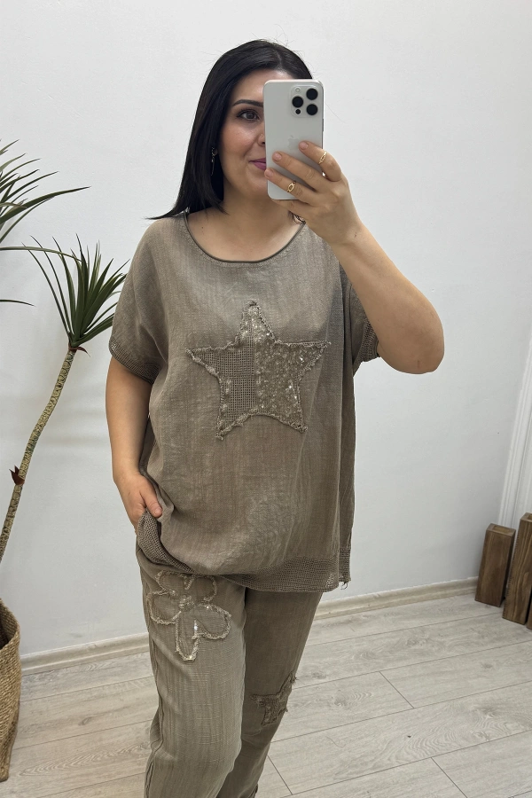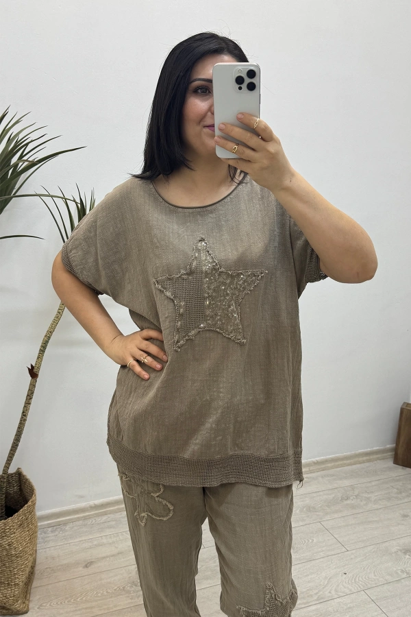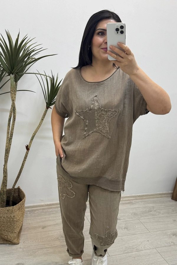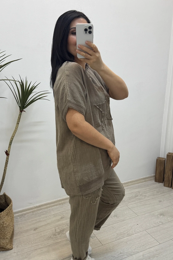 Yıldız Detaylı Kahverengi Keten Takım