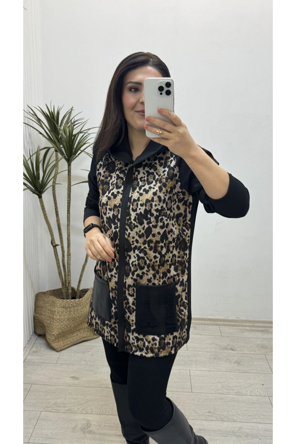 Leopar Desenli Kapüşonlu Ceket