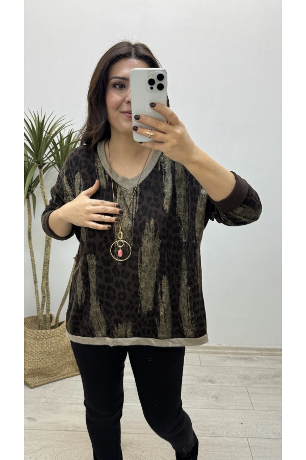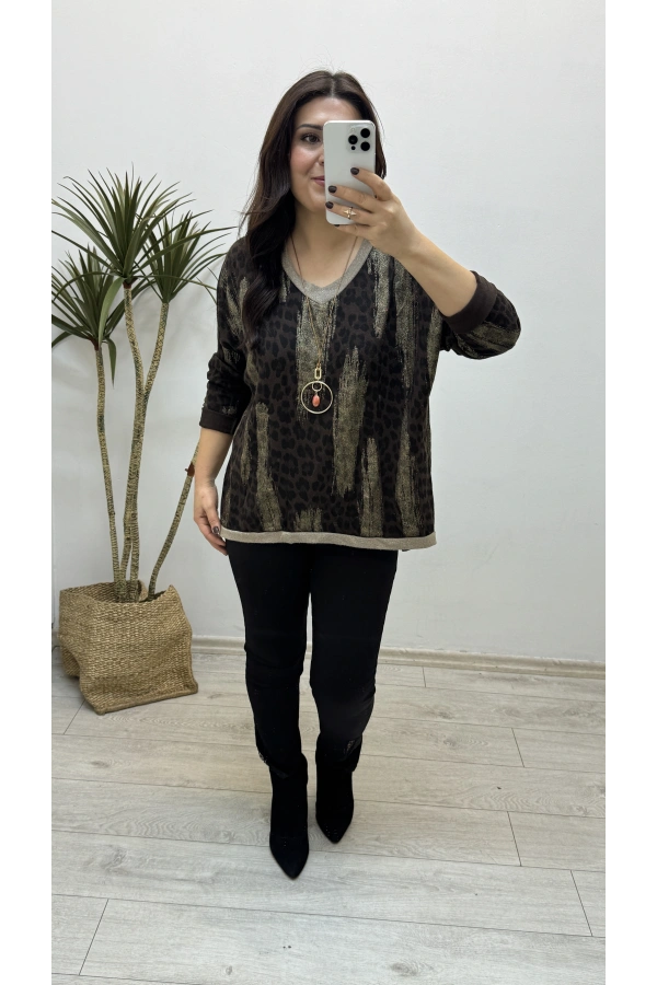 Leopar Desenli V Yaka Kahverengi Yumoş Kazak