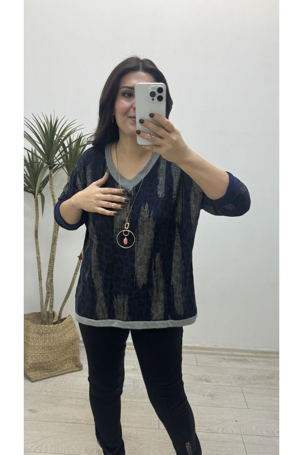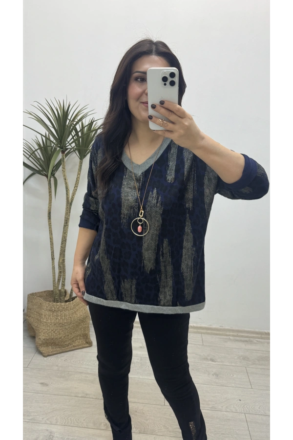 Leopar Desenli V Yaka Lacivert Yumoş Kazak