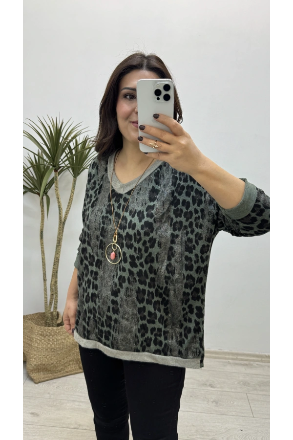 Leopar Desenli V Yaka Siyah Yumoş Kazak