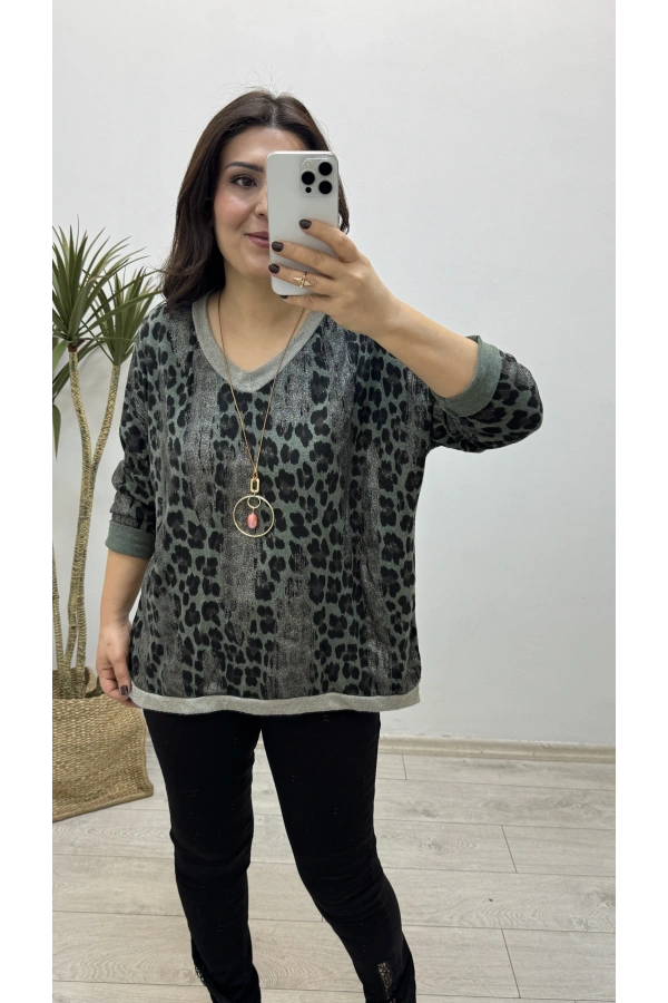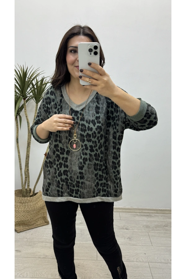 Leopar Sim Baskılı Yeşil V Yaka Bluz