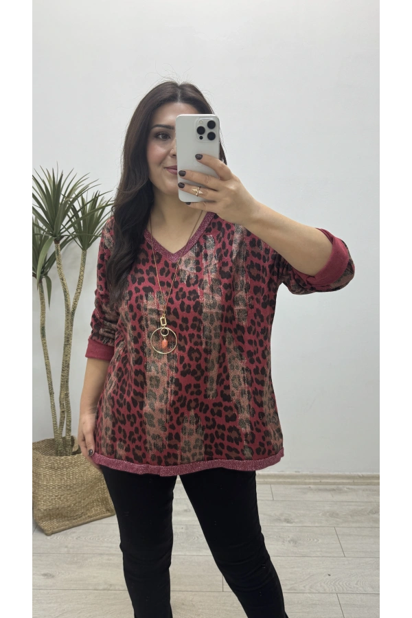 Leopar Sim Baskılı V Yaka Kırmızı Bluz