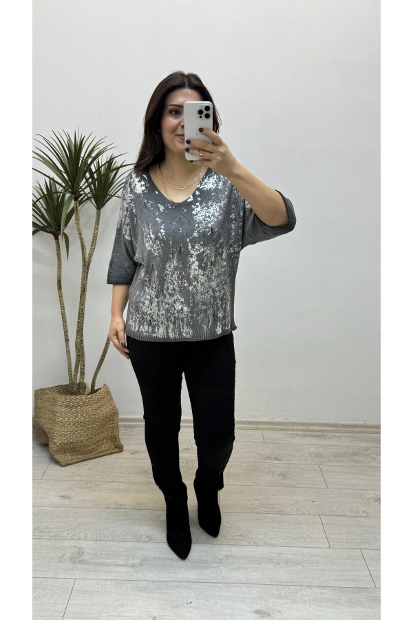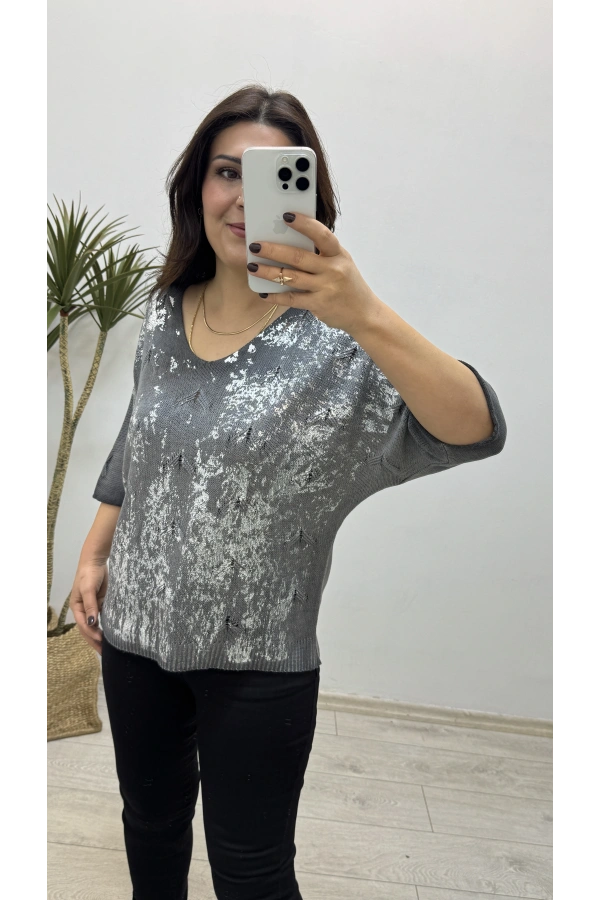 Varaklı Antrasit Rengi İthal Triko Bluz
