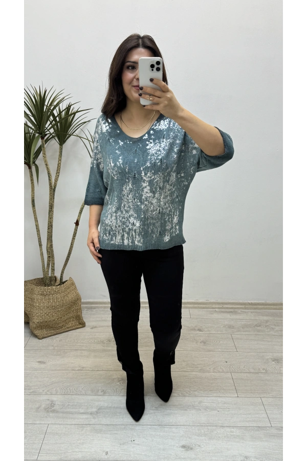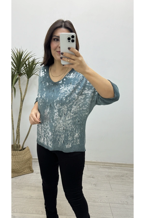 Varaklı Su Yeşili İthal Triko Bluz
