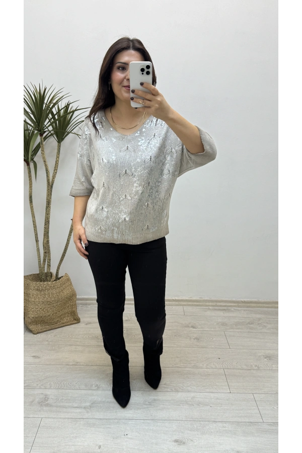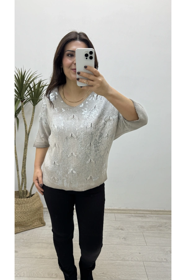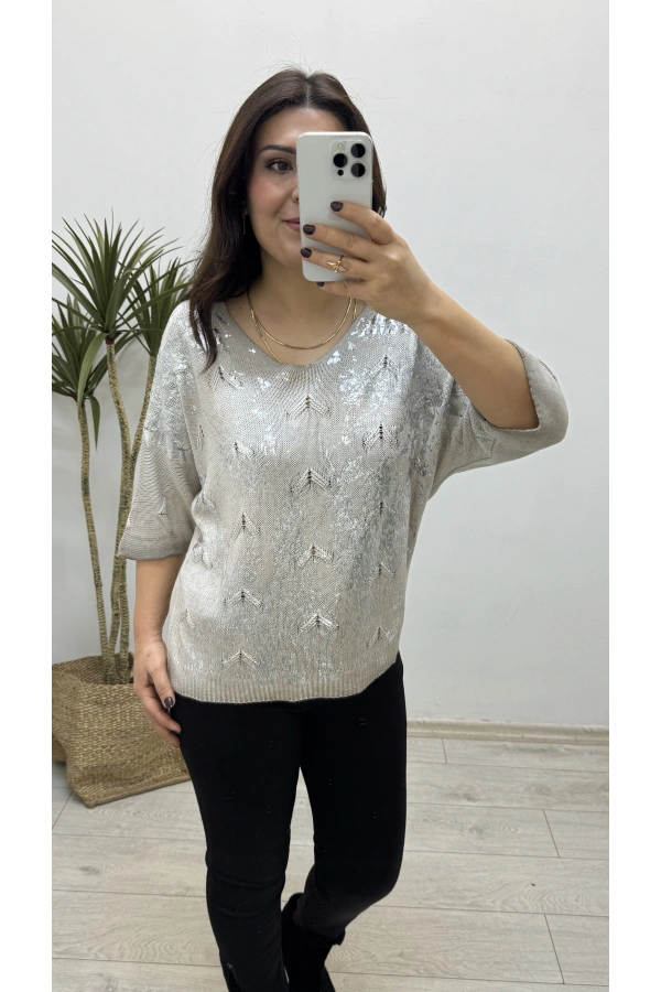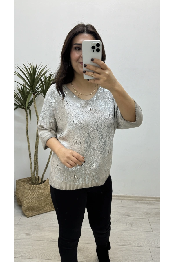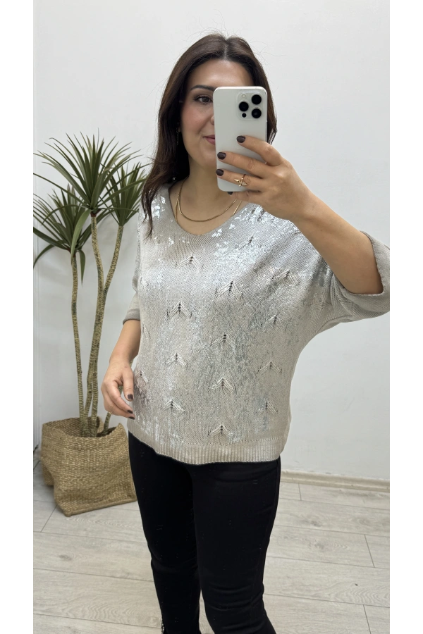 Varaklı Triko Örme Vizon Rengi İthal Bluz
