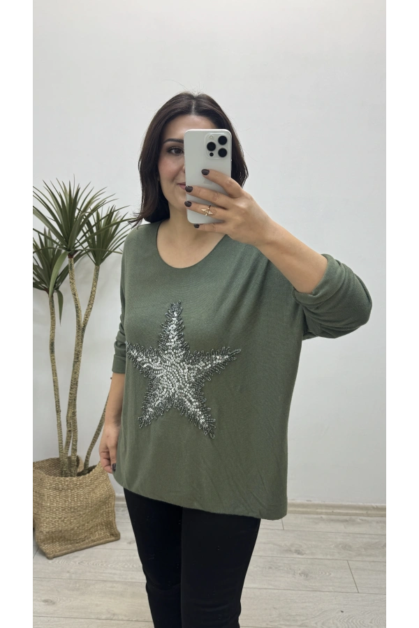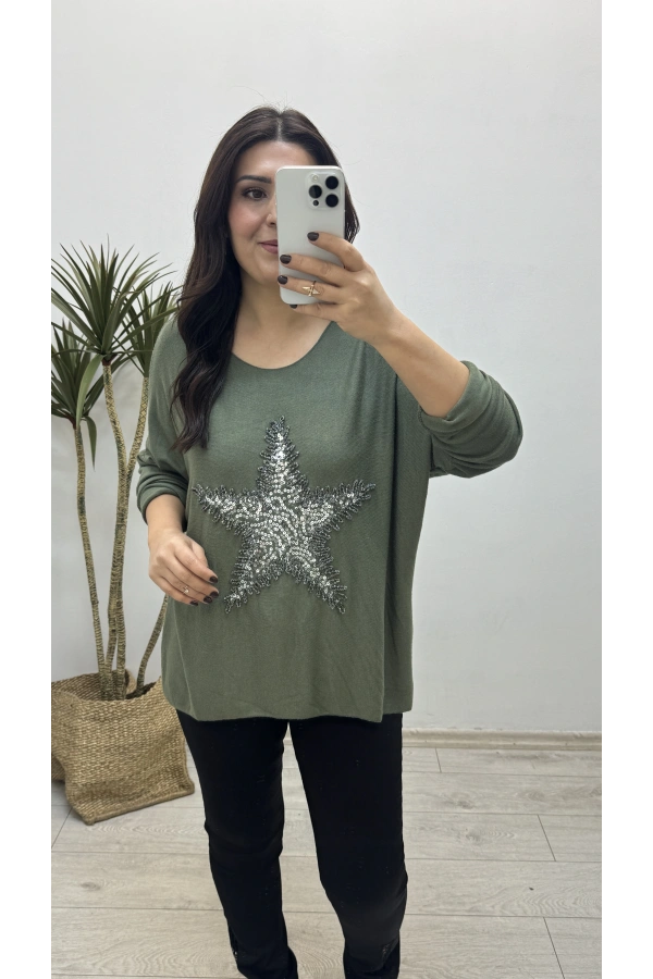 Yıldız Desenli Haki Yeşil İthal Bluz