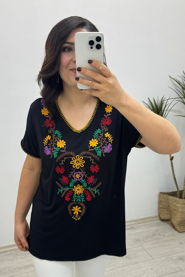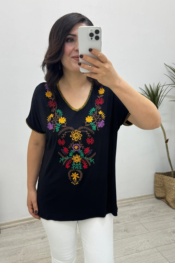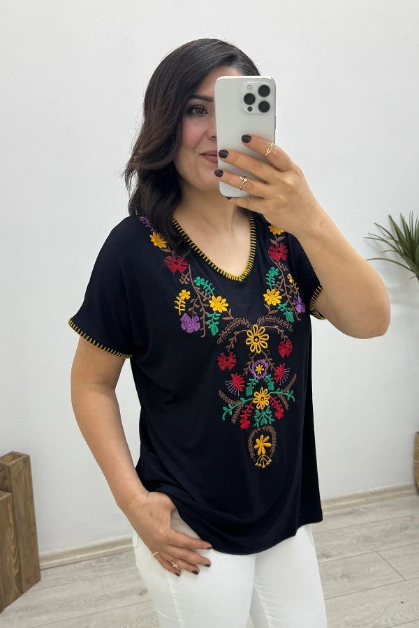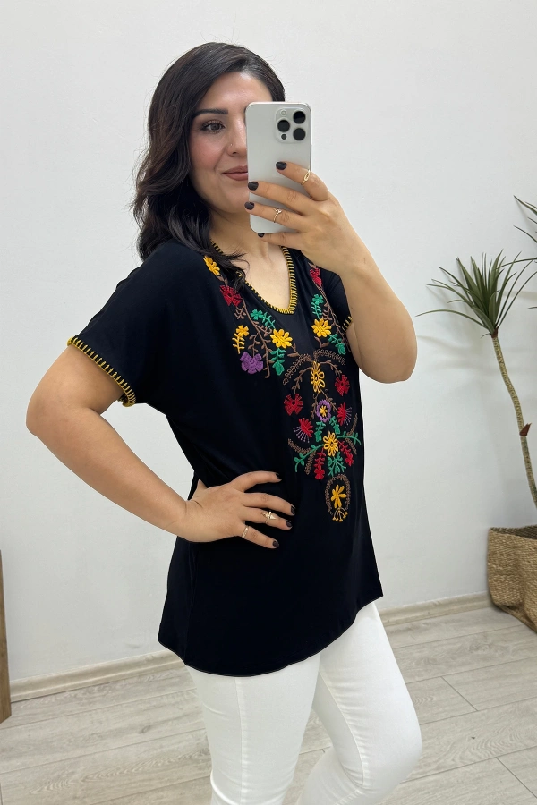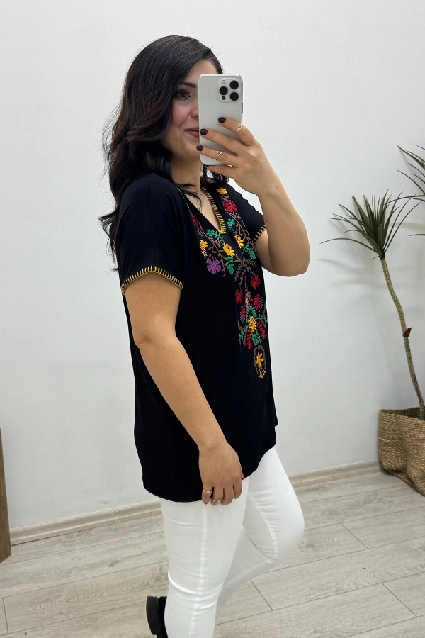Nakış İşlemeli V Yakalı Siyah Bluz