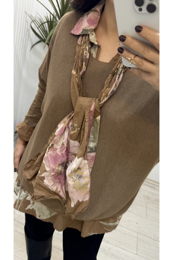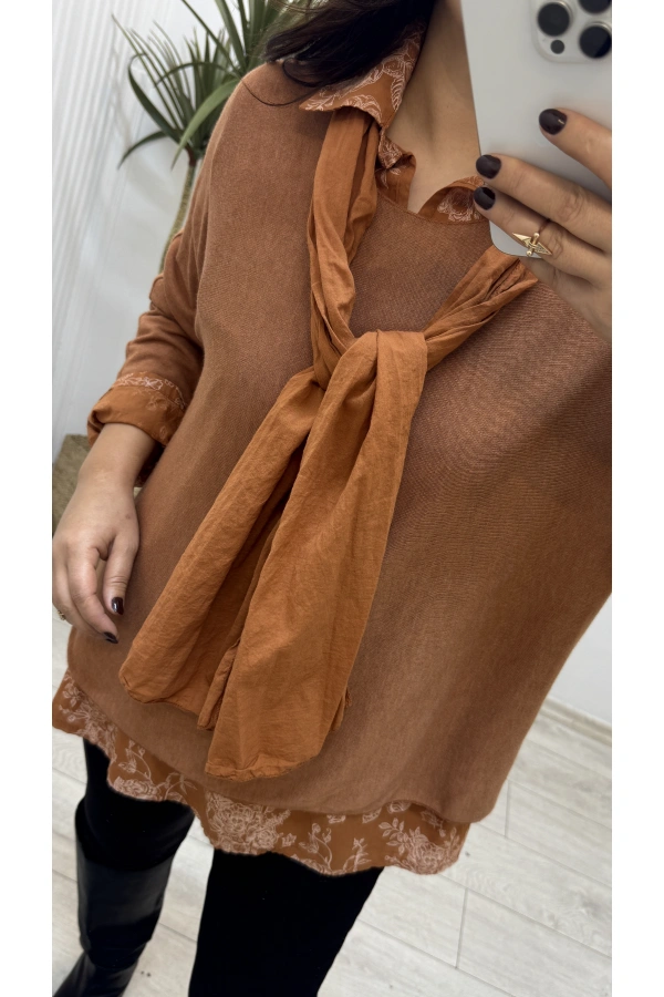 İthal Fularlı Tarçın Rengi İkili Bluz