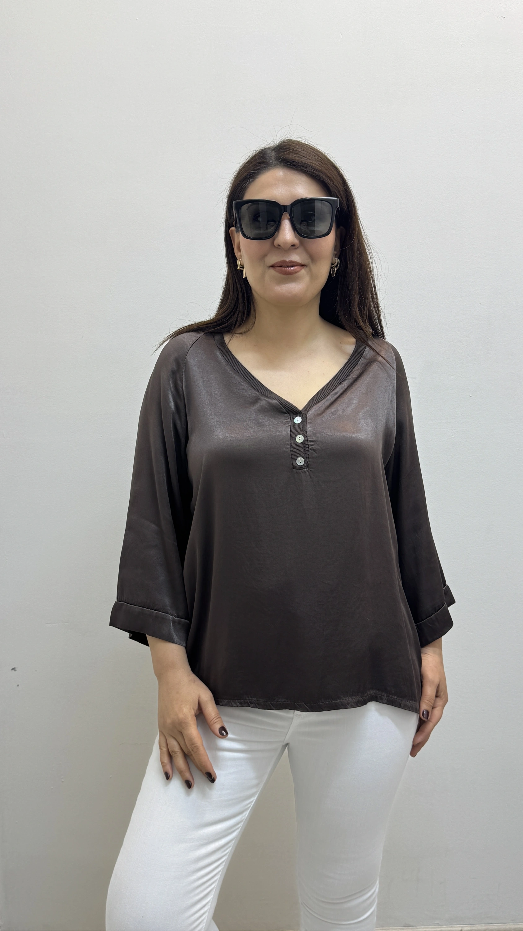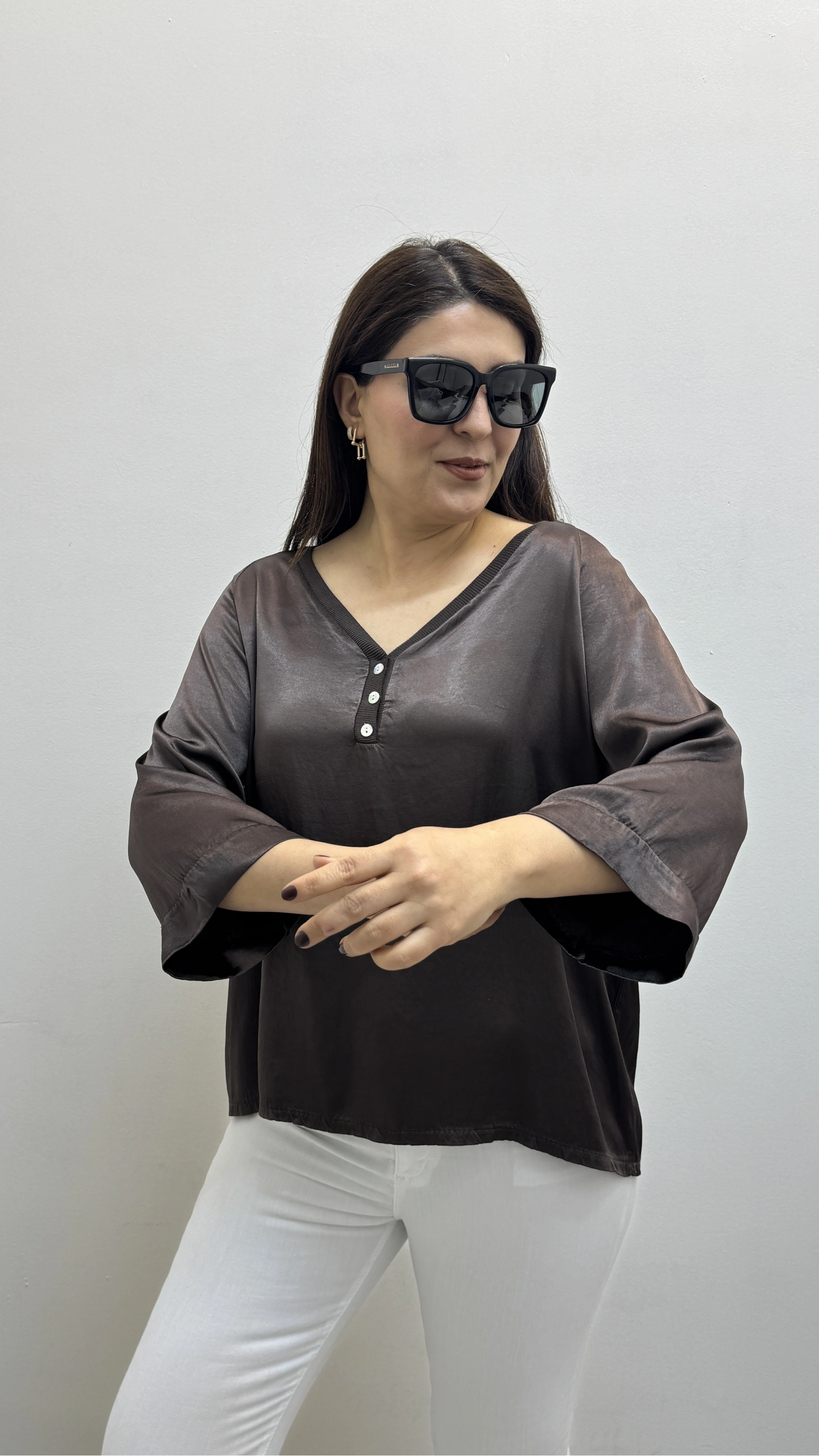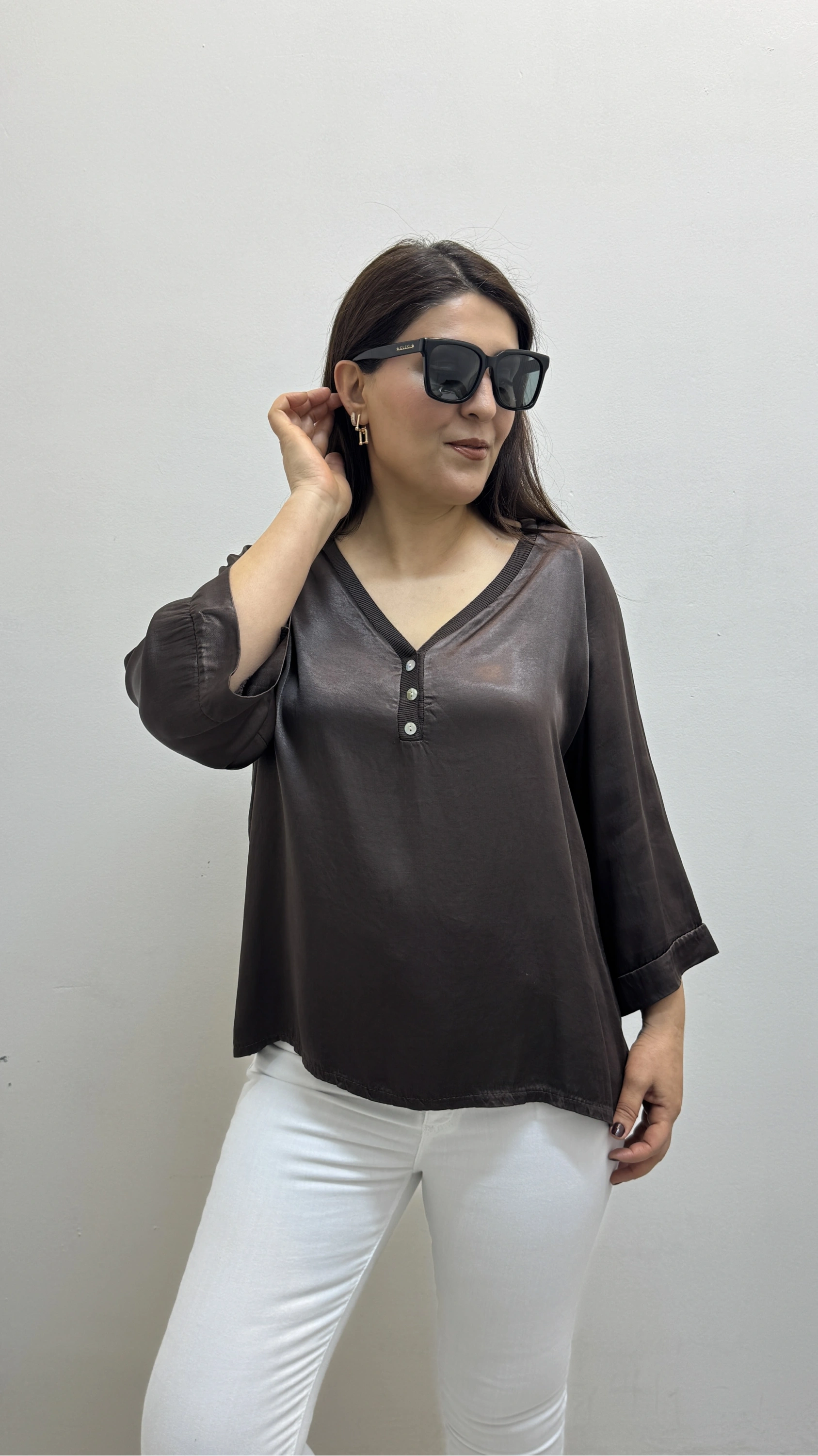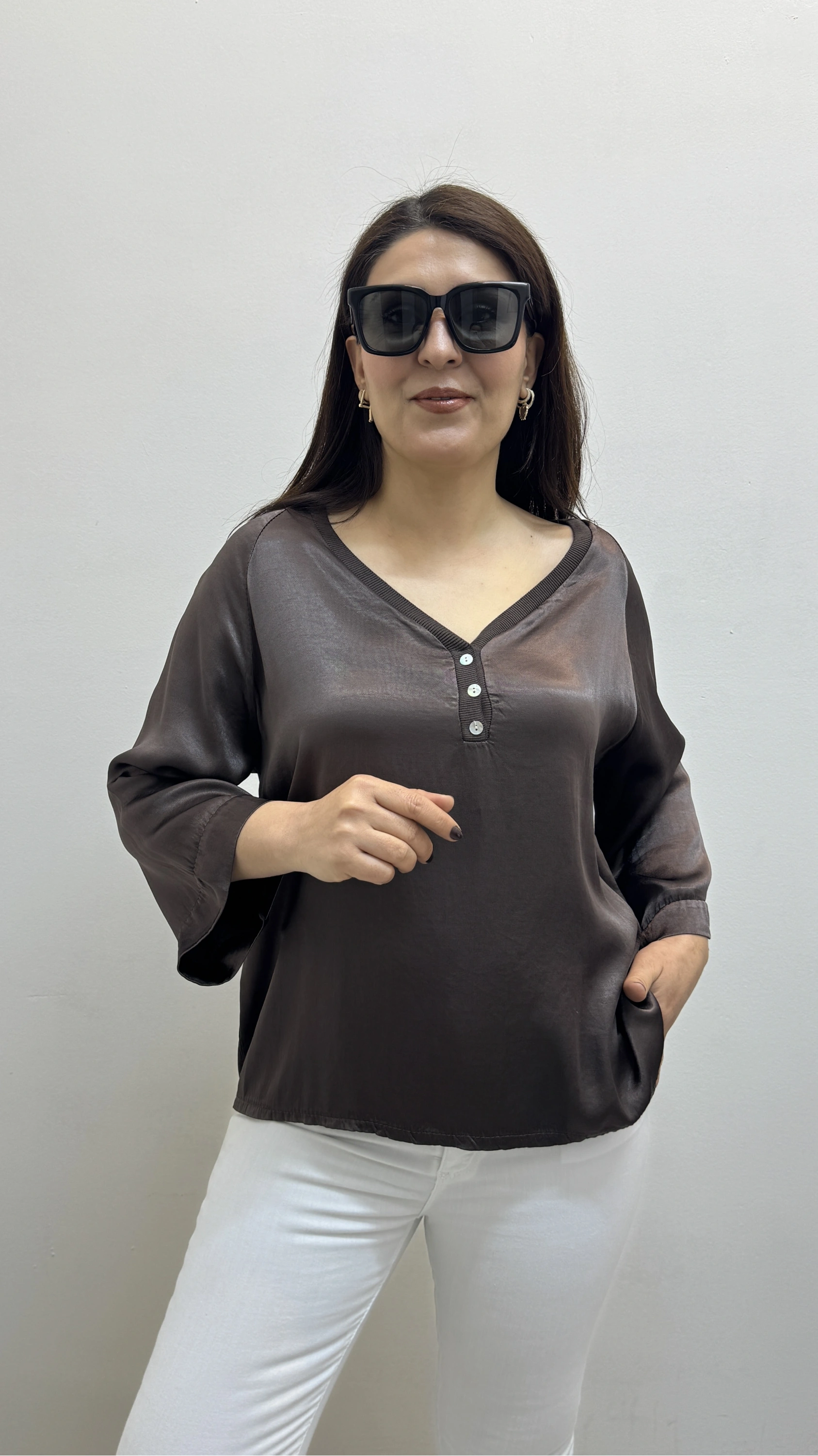 V Yaka Düğme Detaylı Kahverengi Saten İthal Bluz