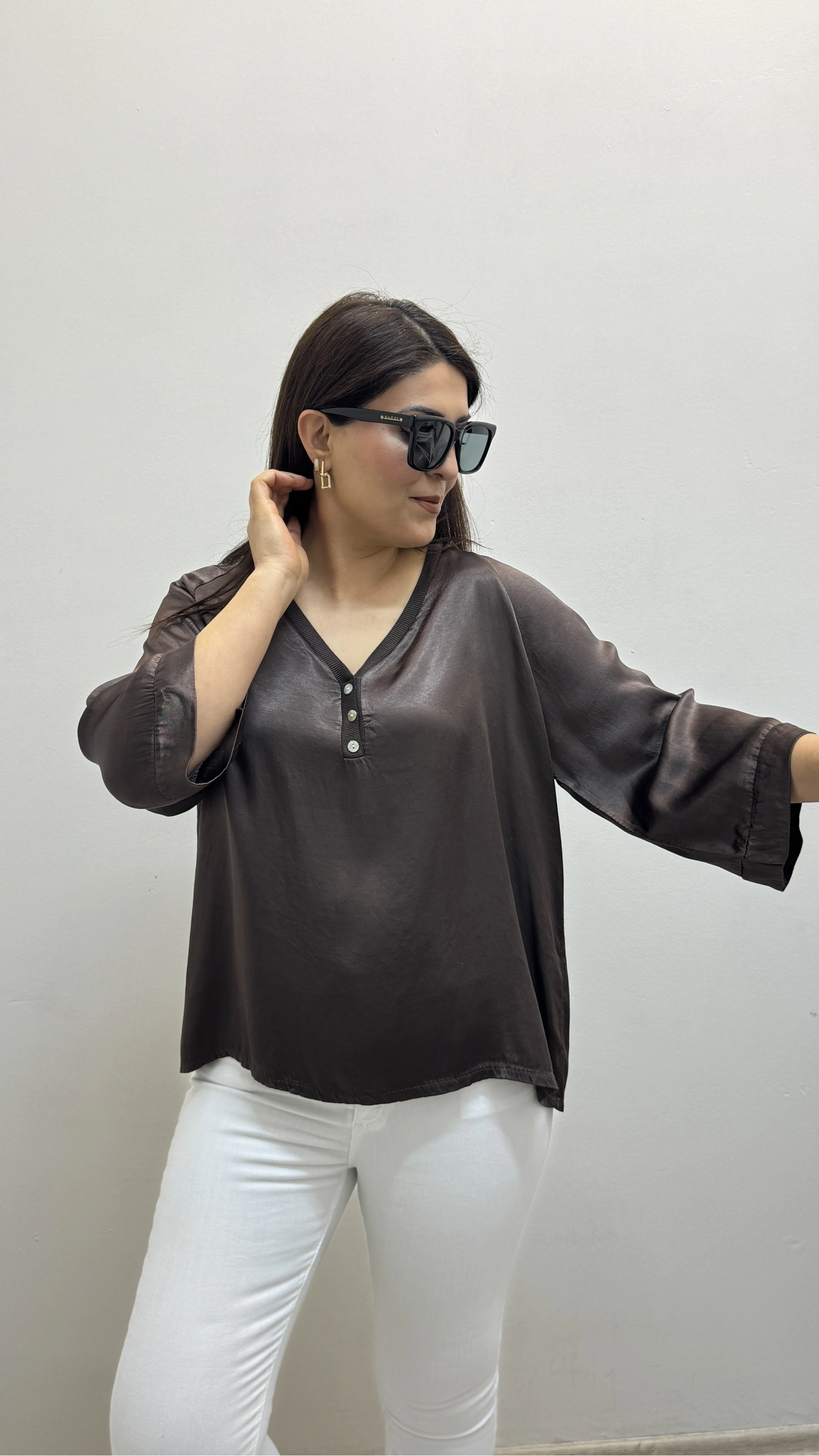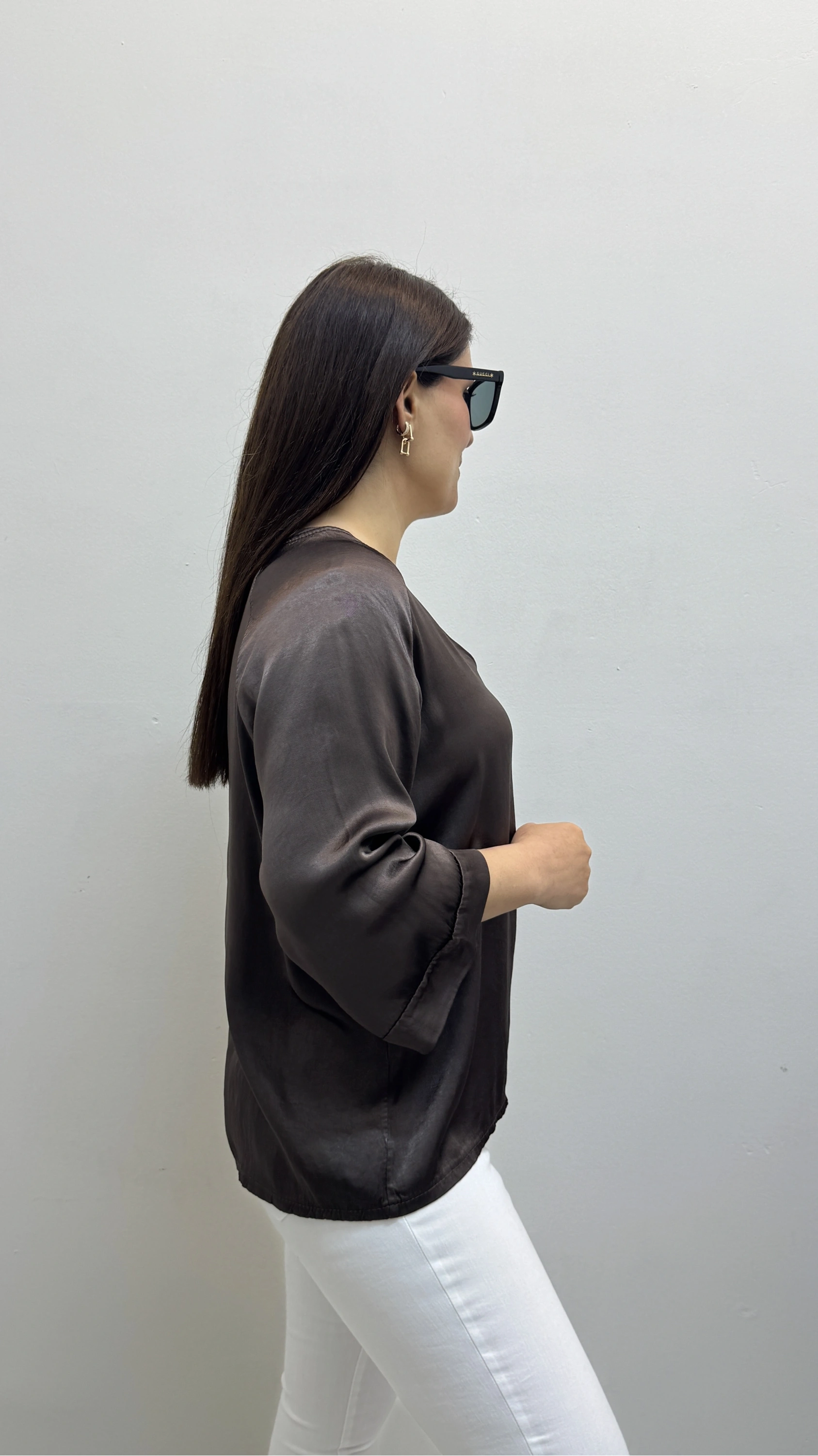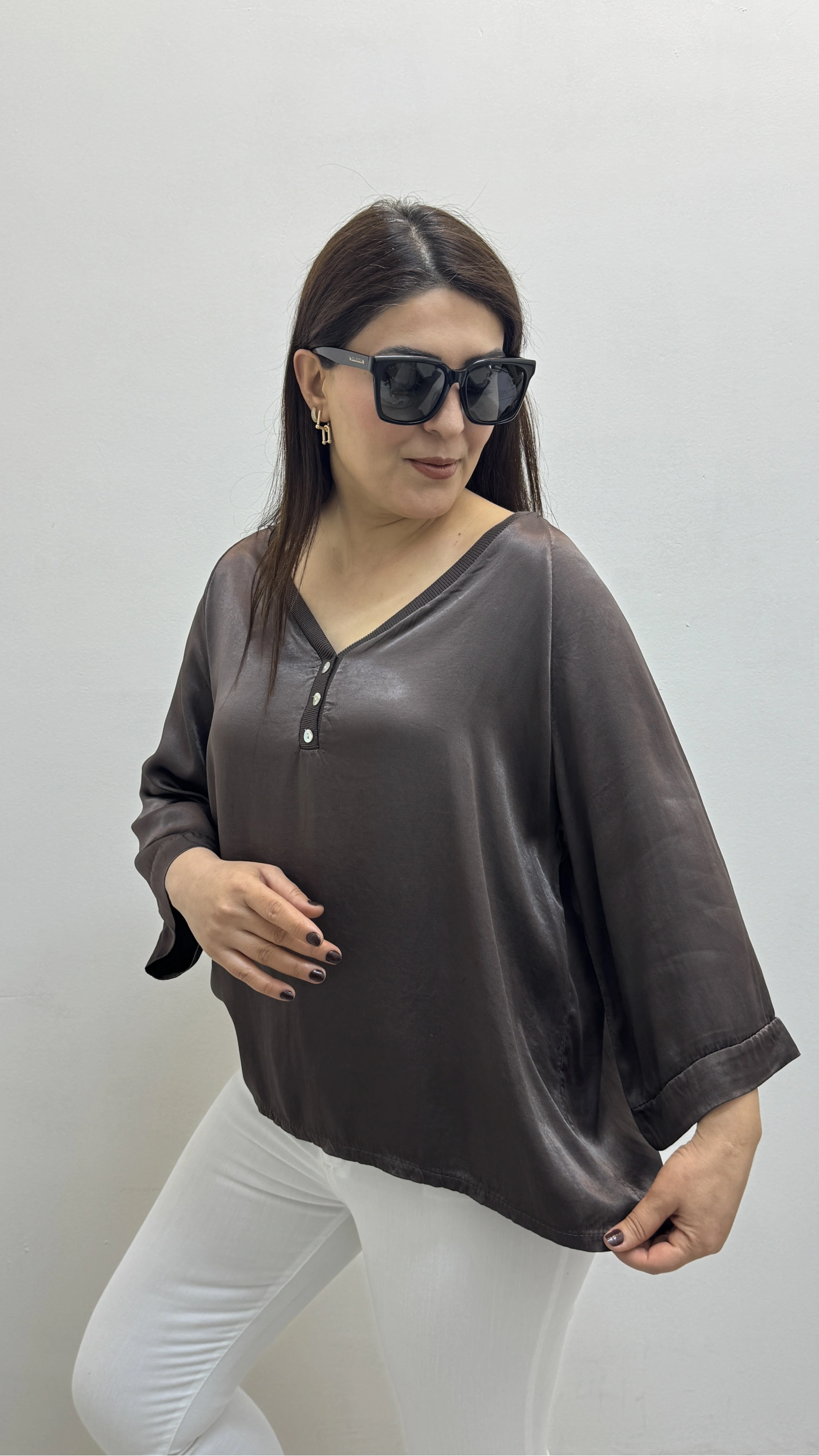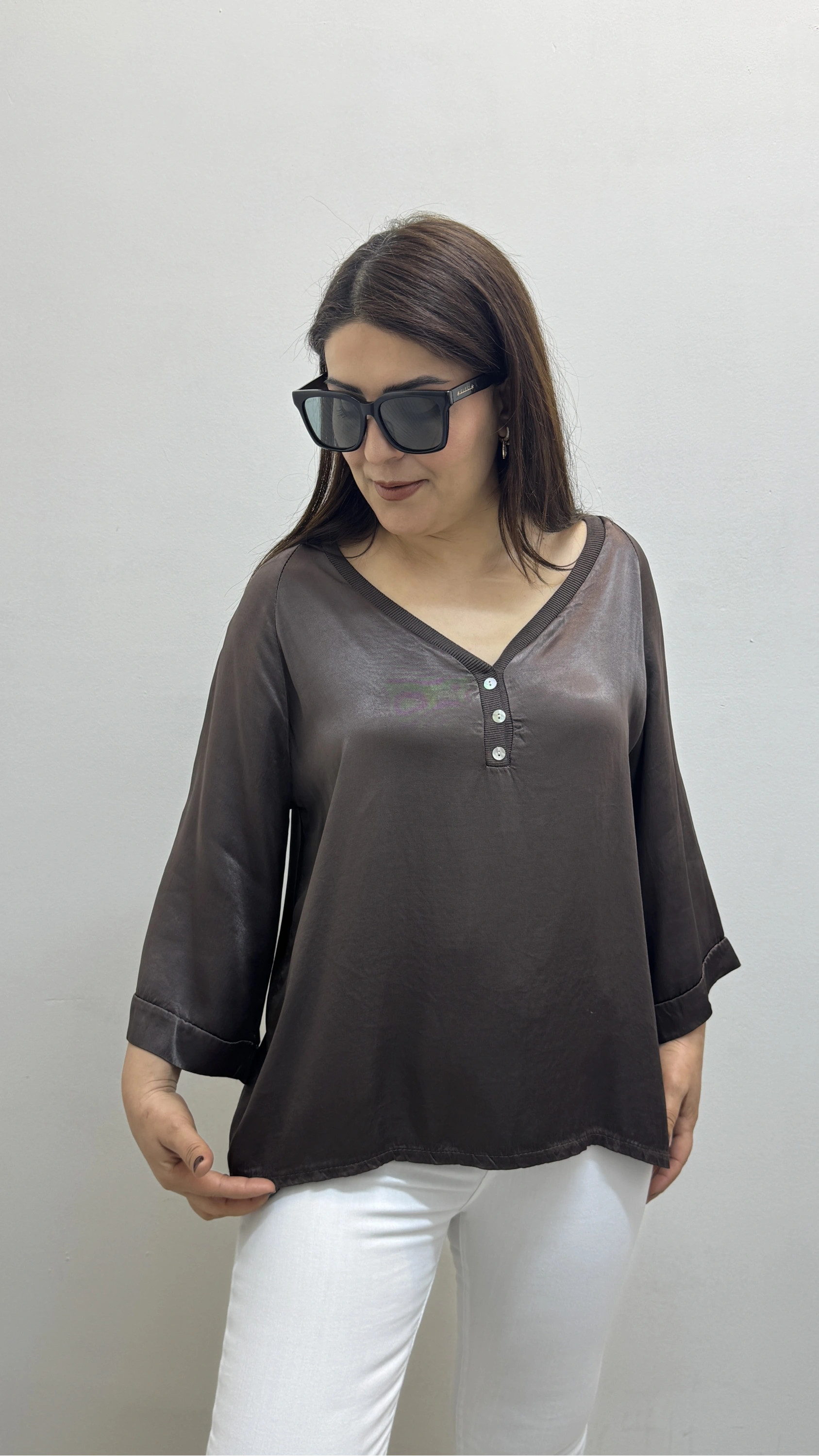 V Yaka Düğme Detaylı Kahverengi Saten İthal Bluz