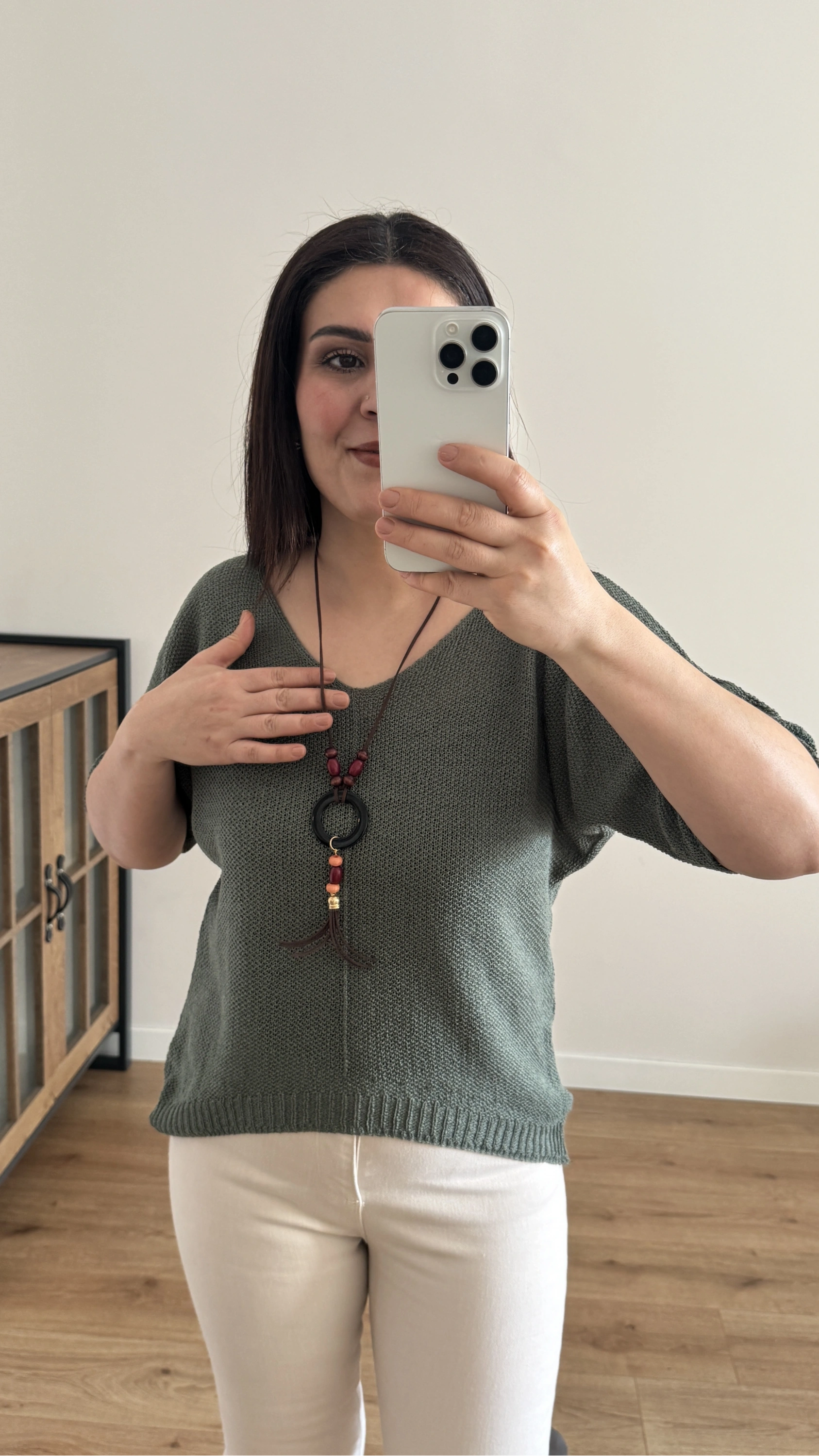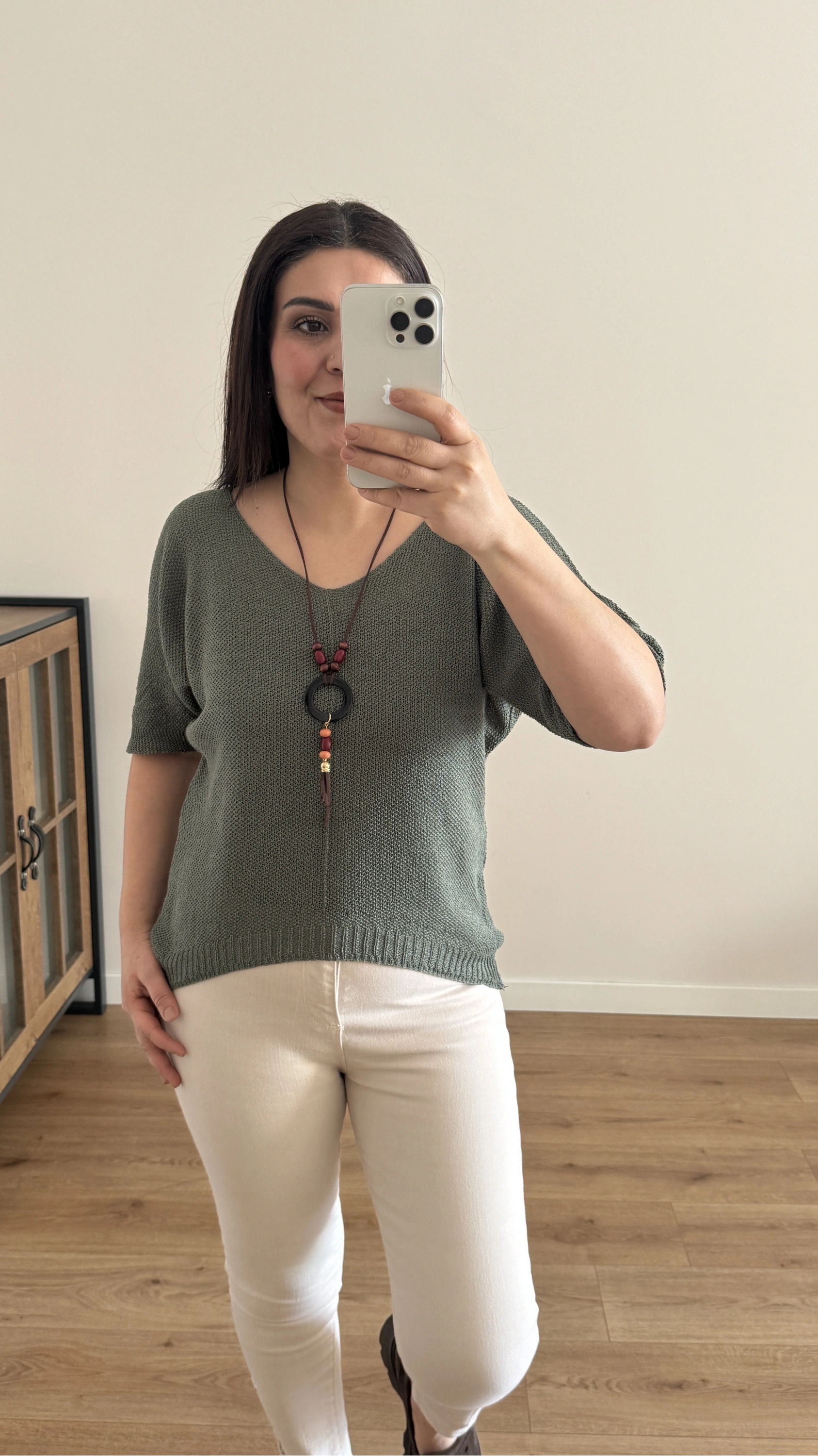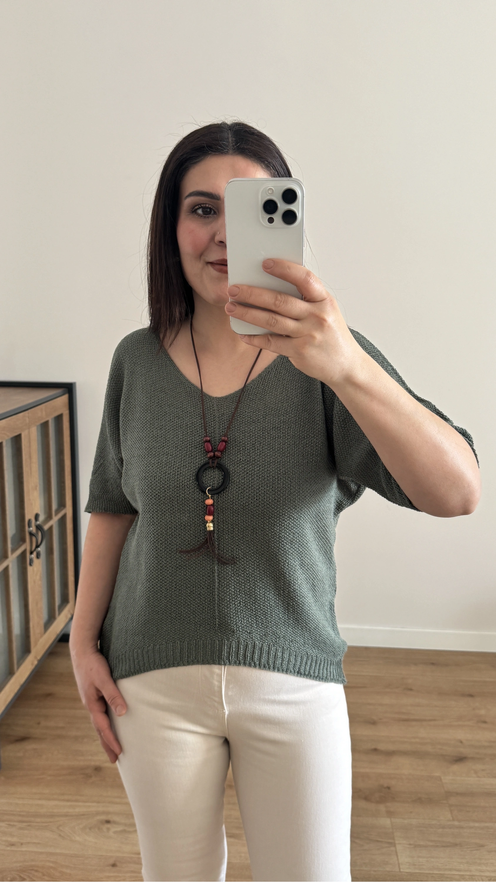 V Yaka Haki Yeşil Kolyeli İthal Bluz