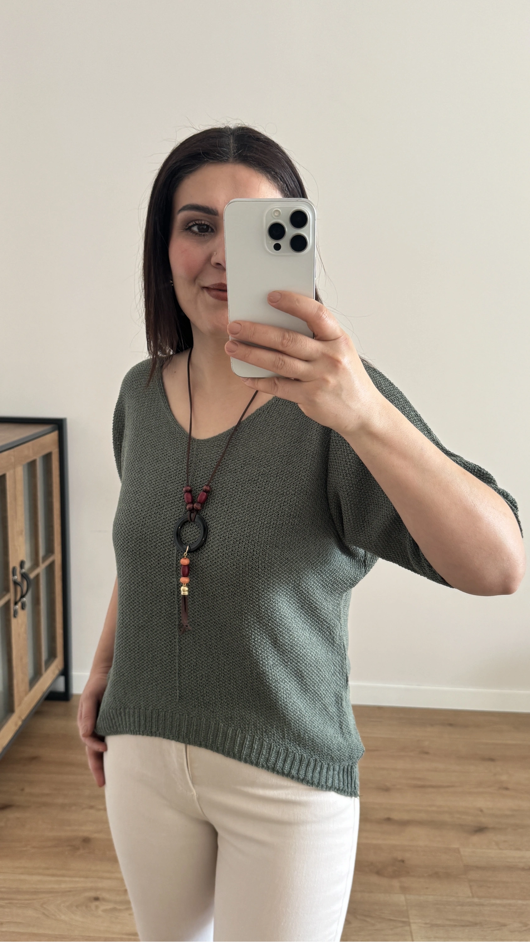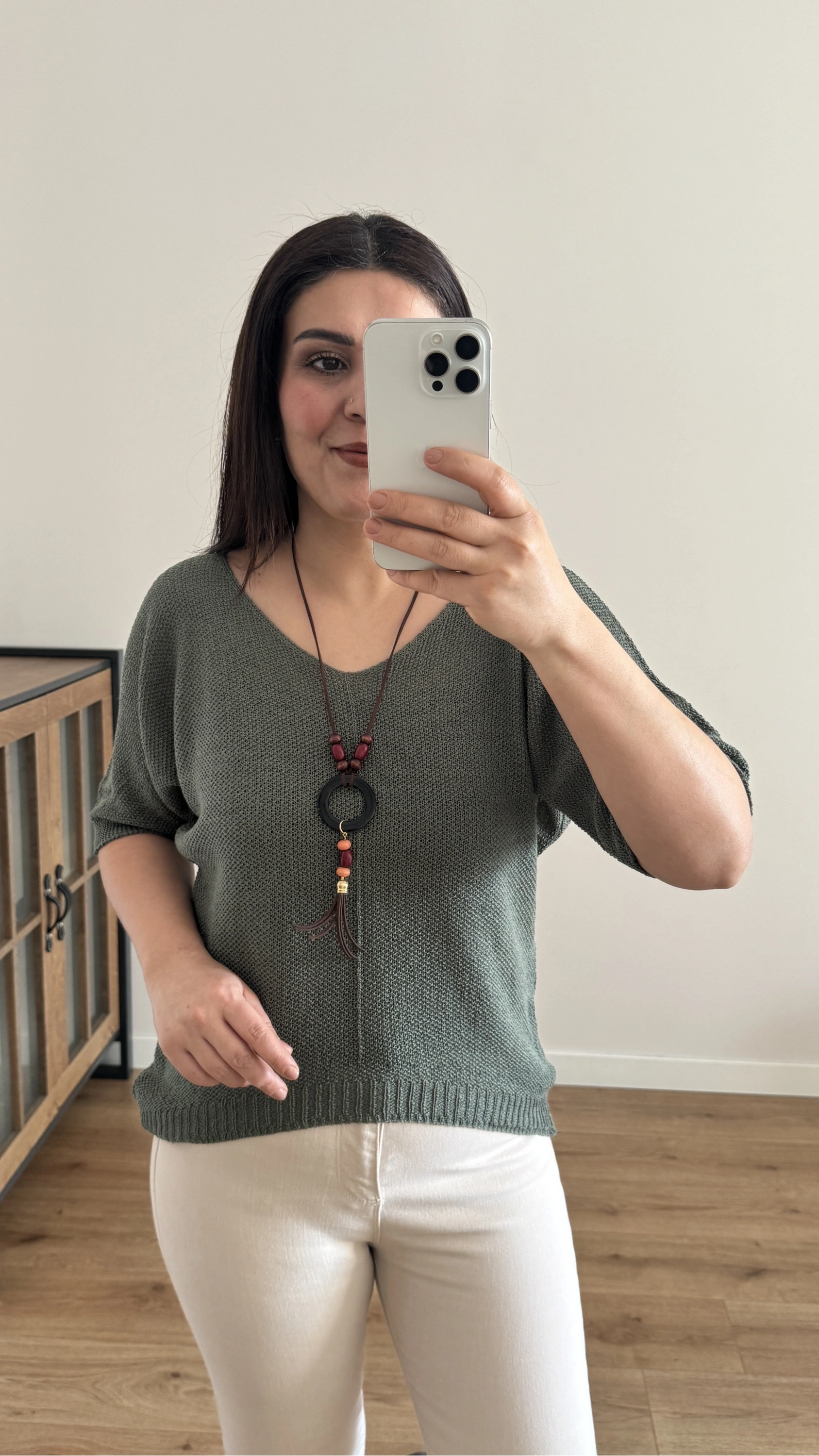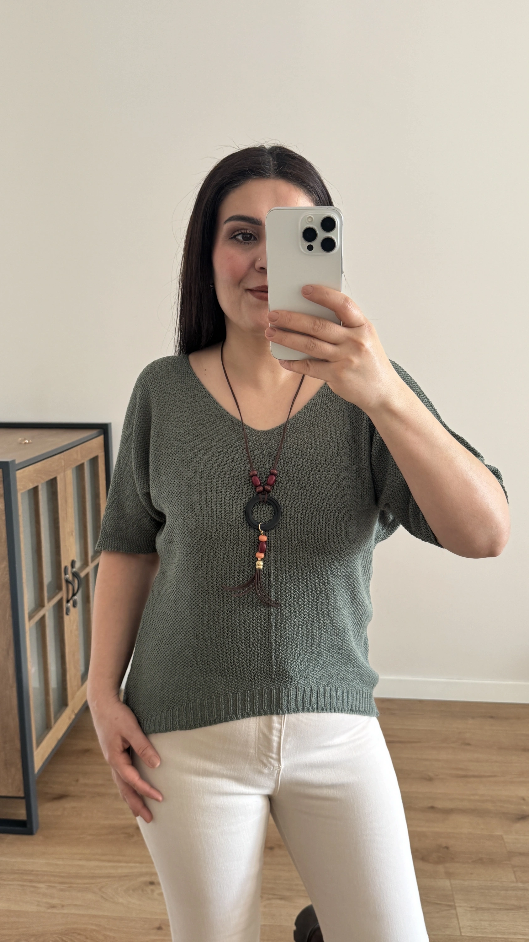 V Yaka Haki Yeşil Kolyeli İthal Bluz