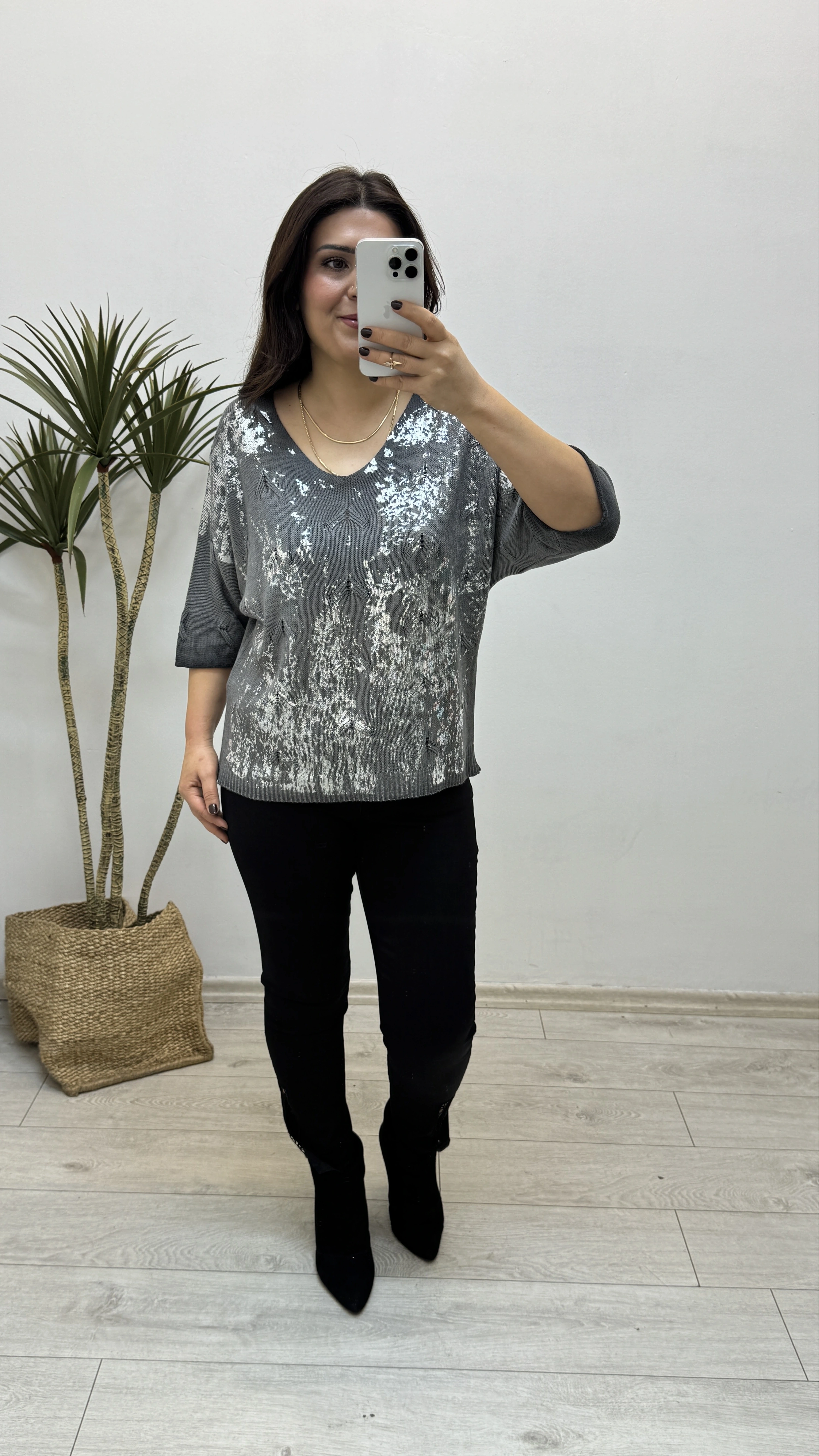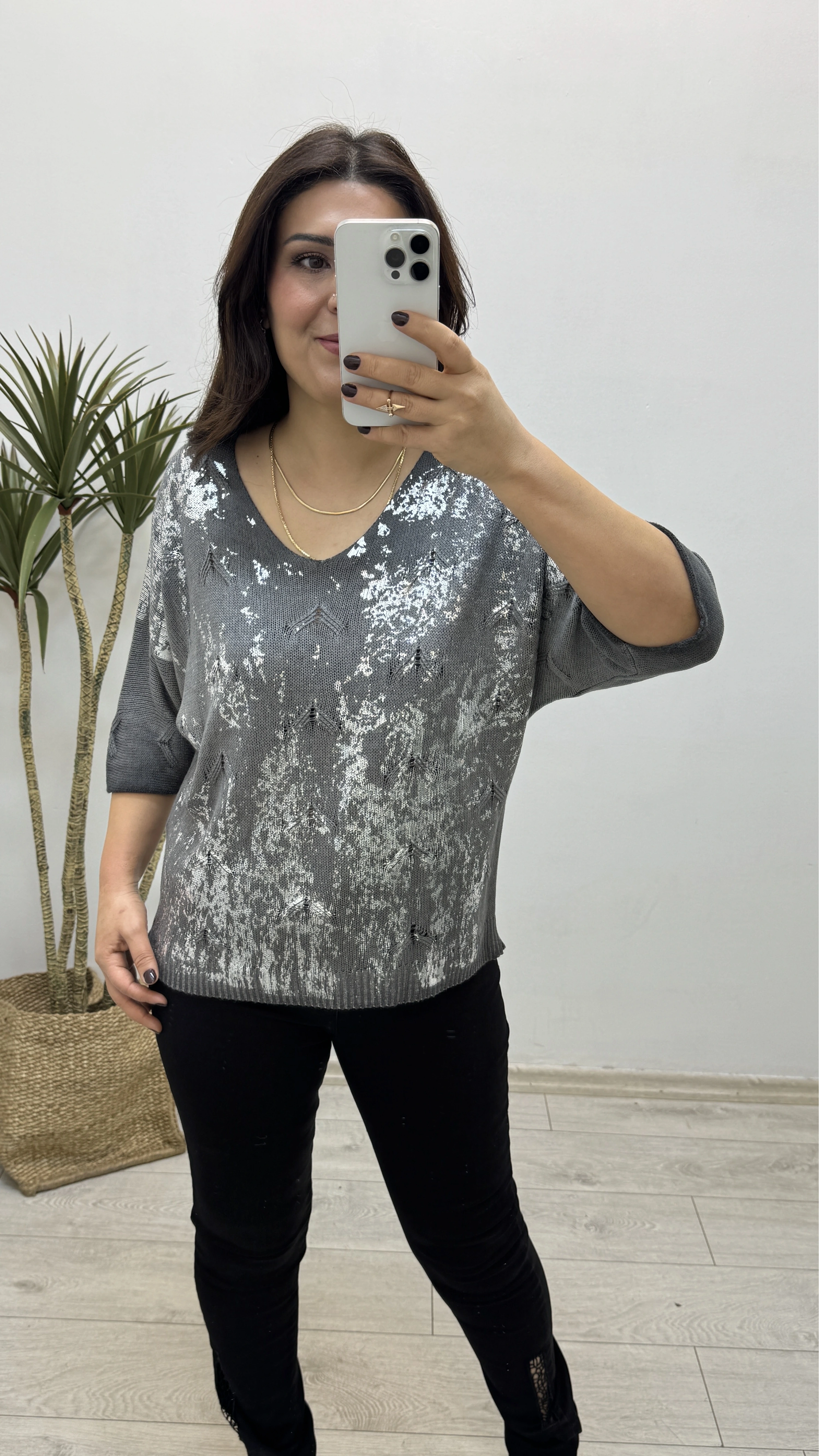 Varaklı Antrasit Rengi İthal Triko Bluz