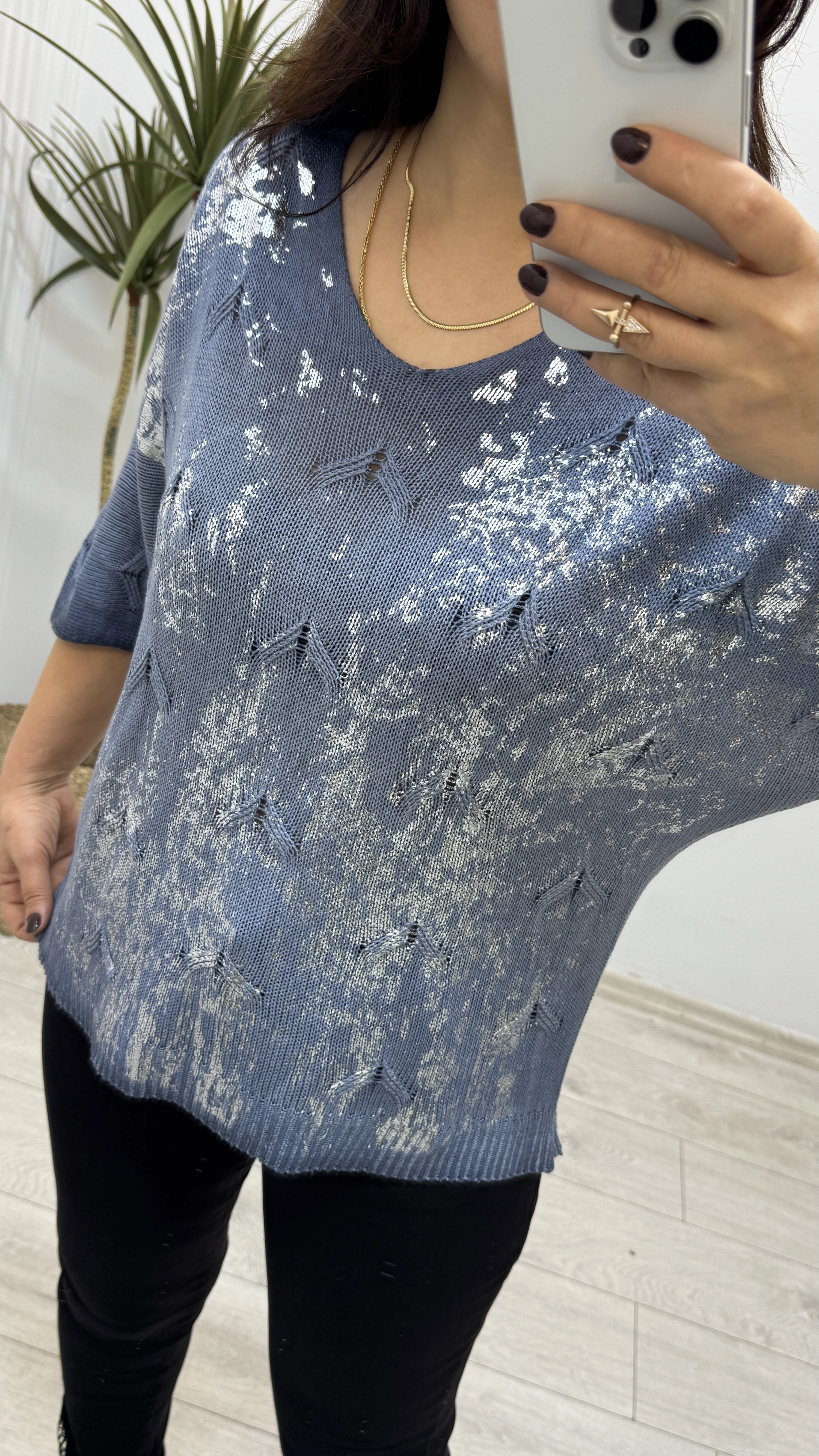 Varaklı İndigo Mavi İthal Triko Bluz