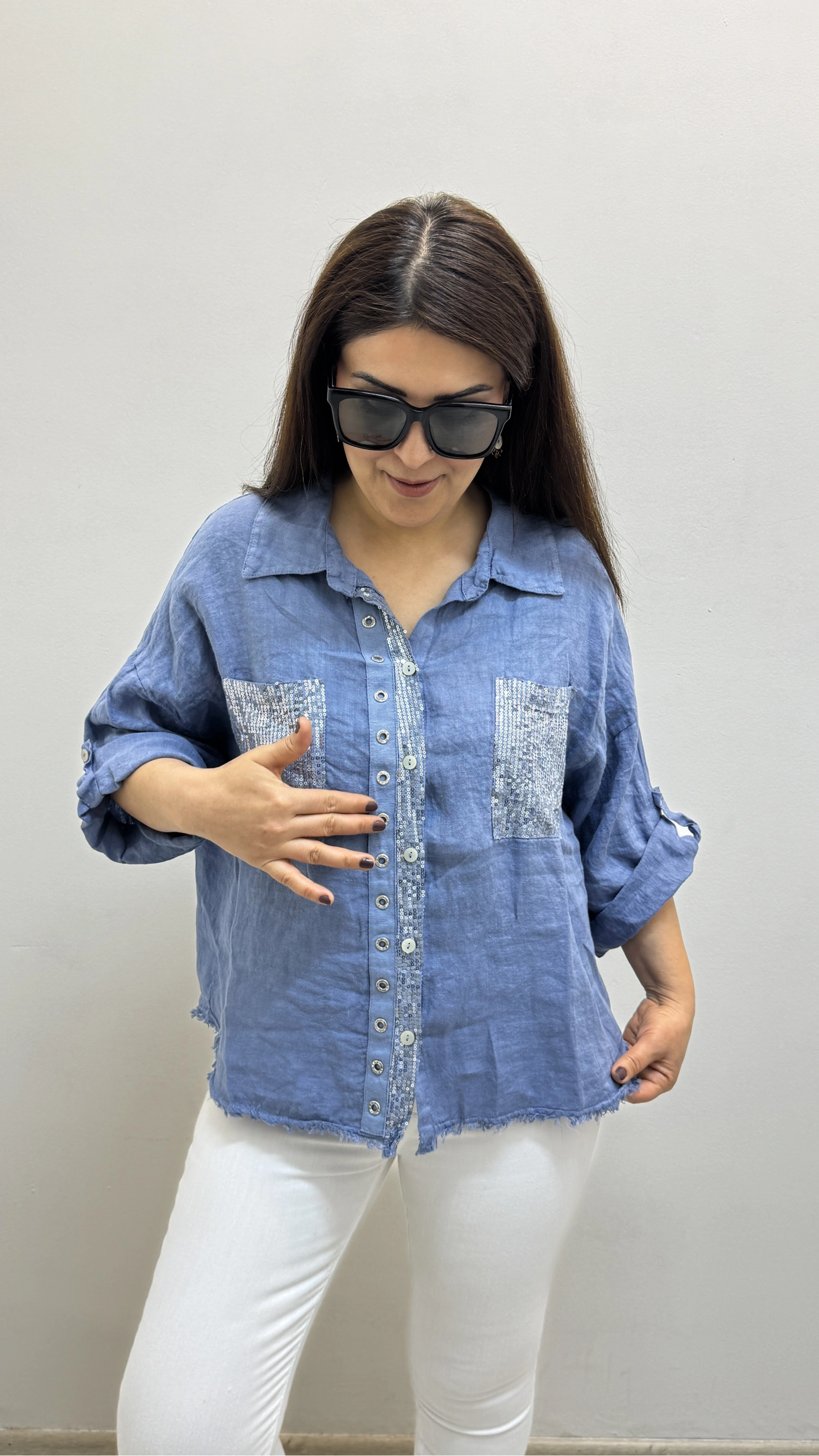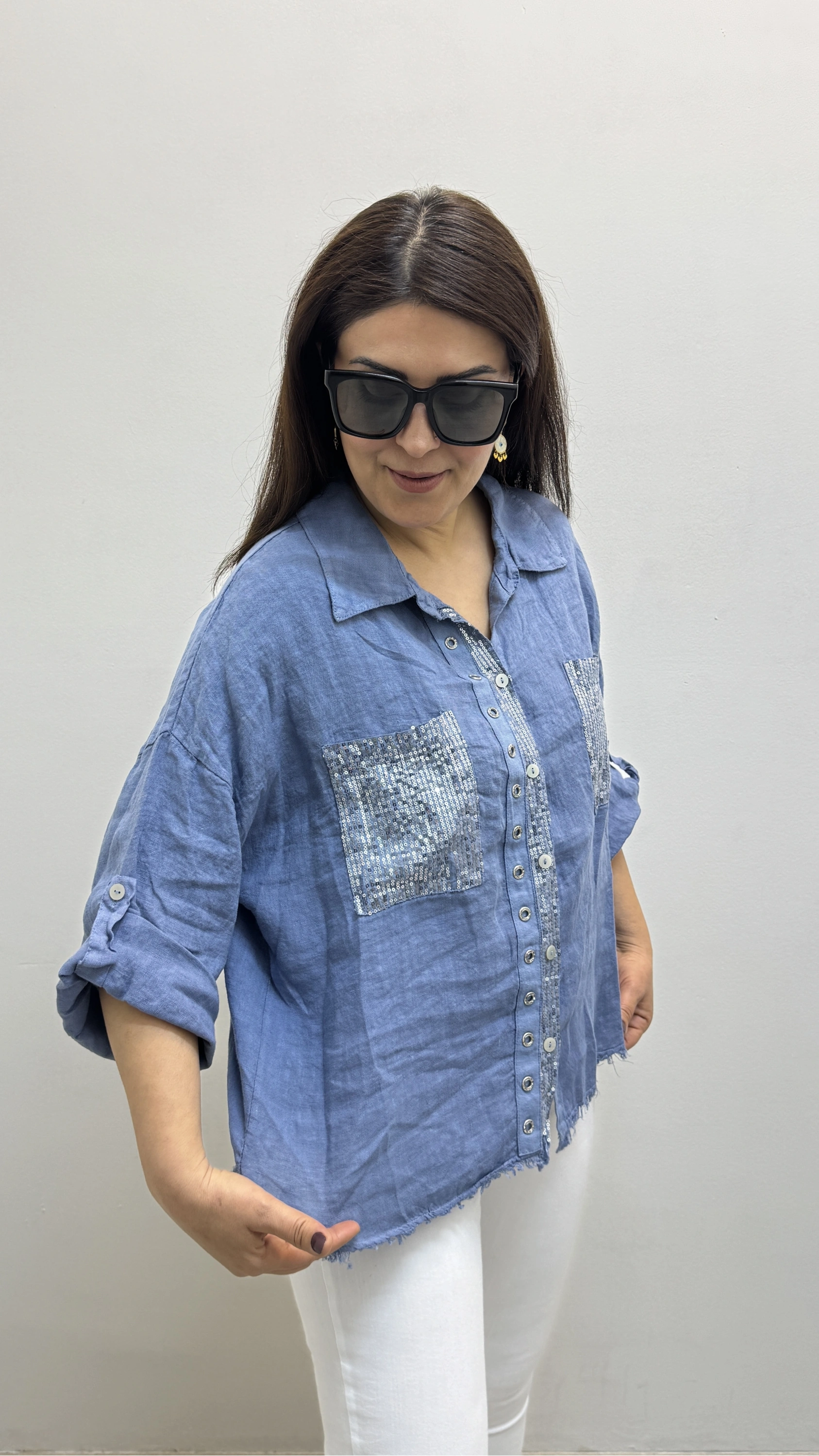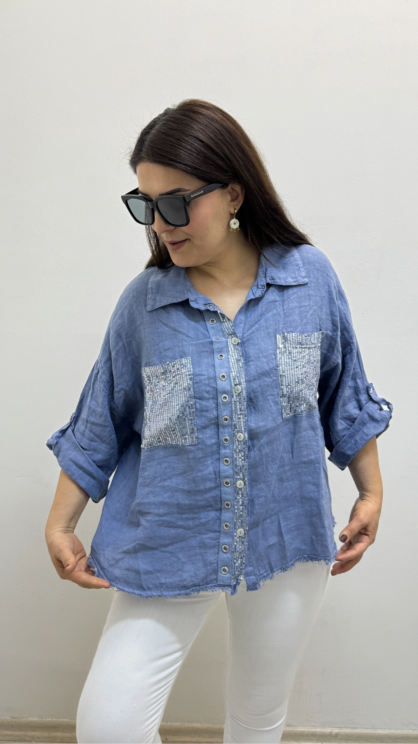 Yakalı Dirsek Kol Pul Payet İşlemeli Mavi İthal Keten Gömlek Hakkında