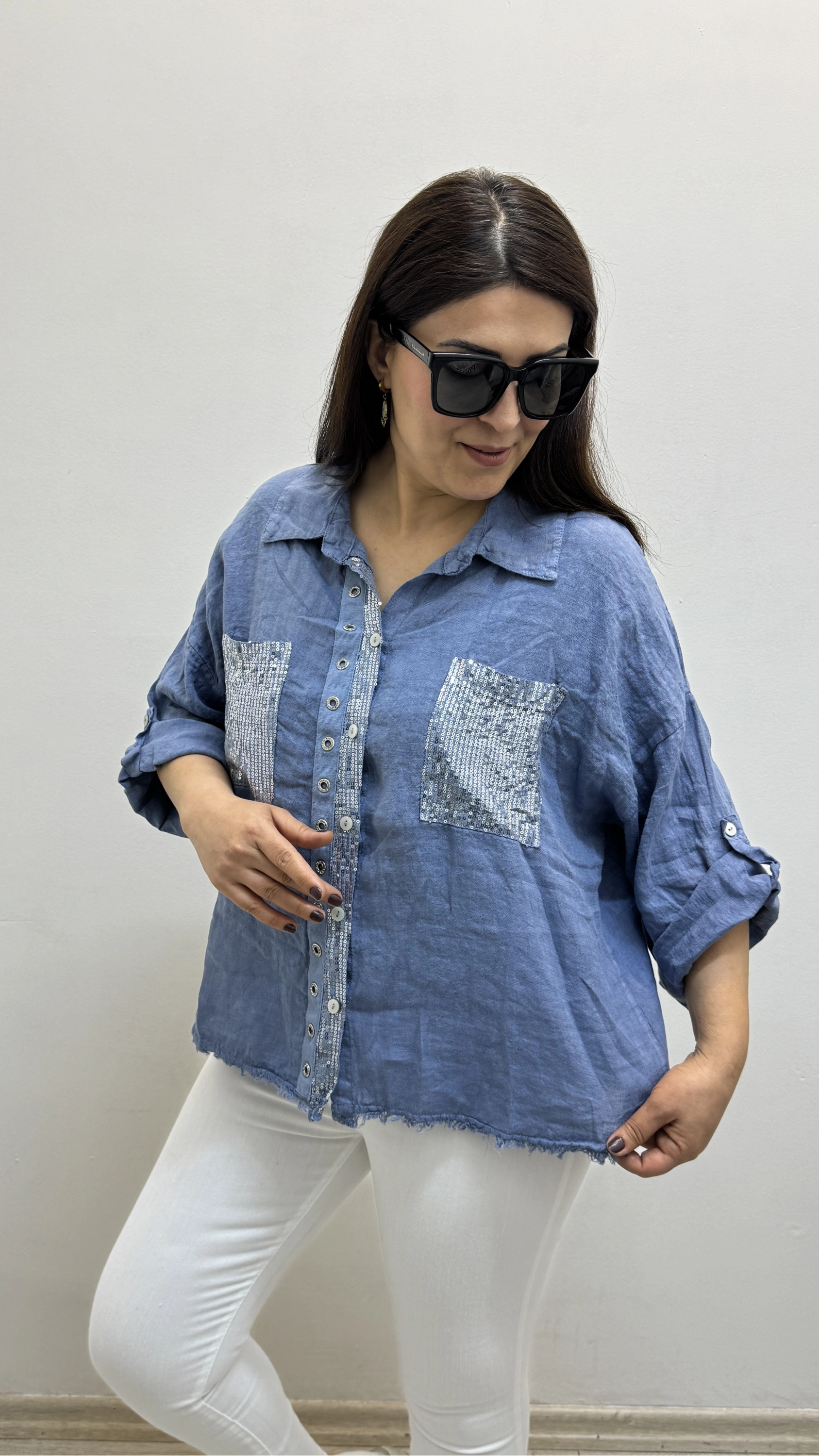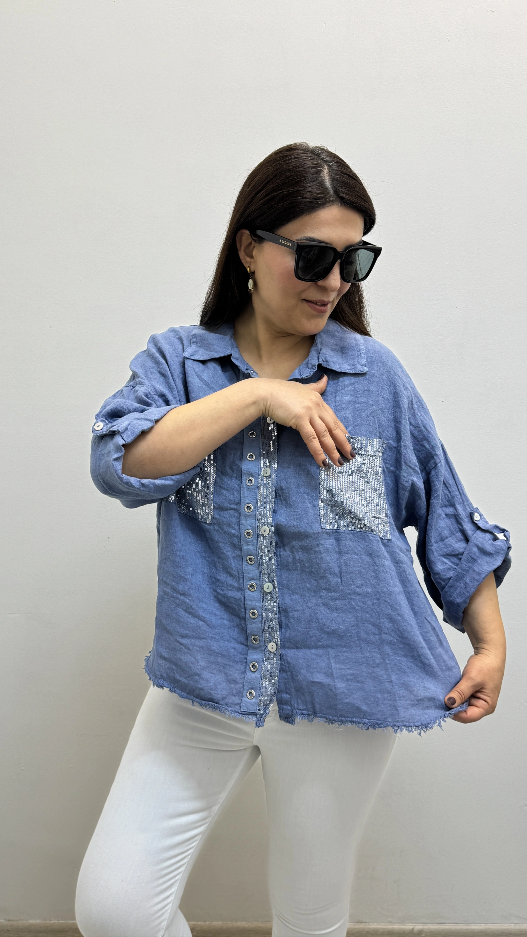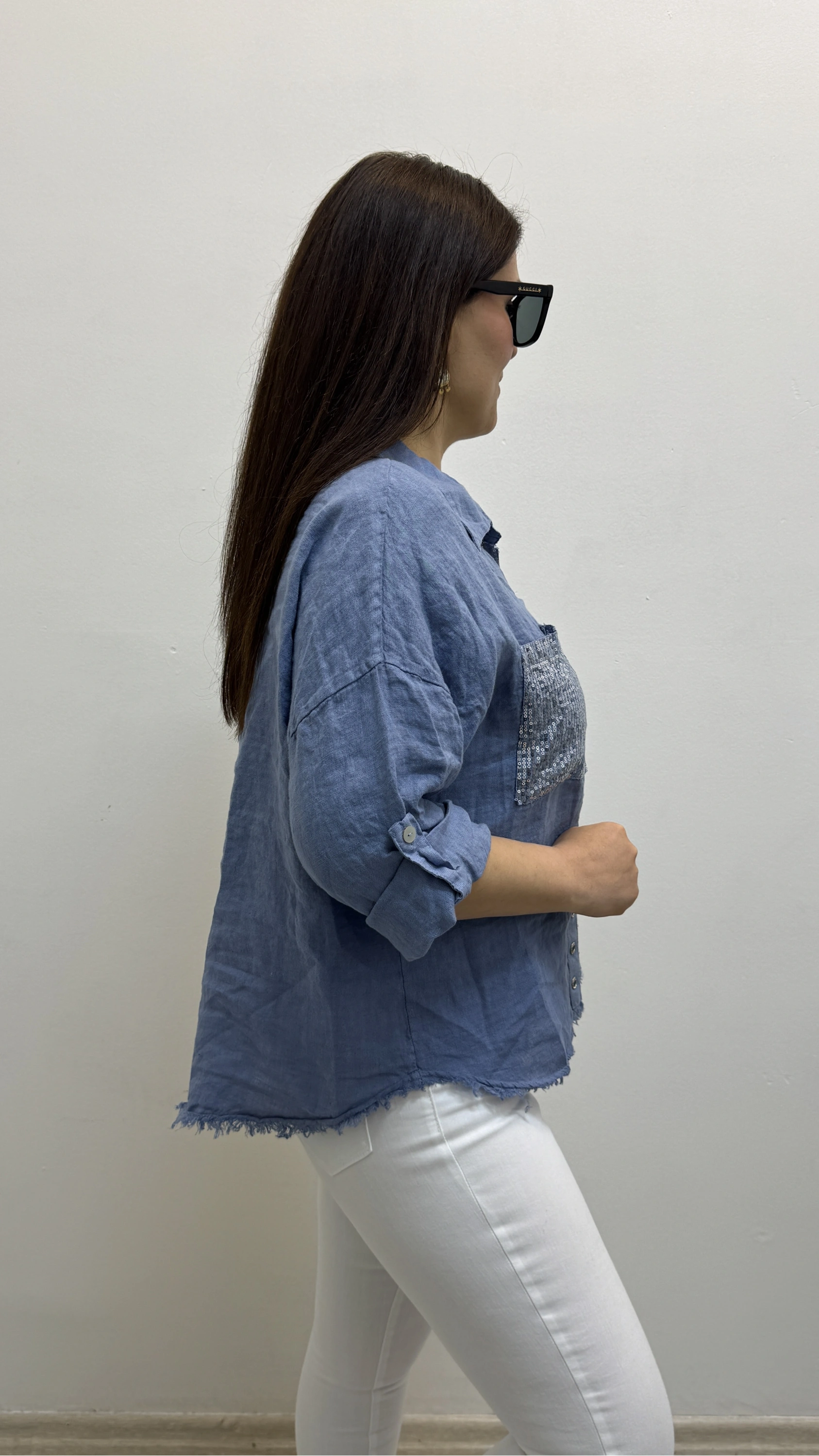 Yakalı Dirsek Kol Pul Payet İşlemeli Mavi İthal Keten Gömlek Hakkında