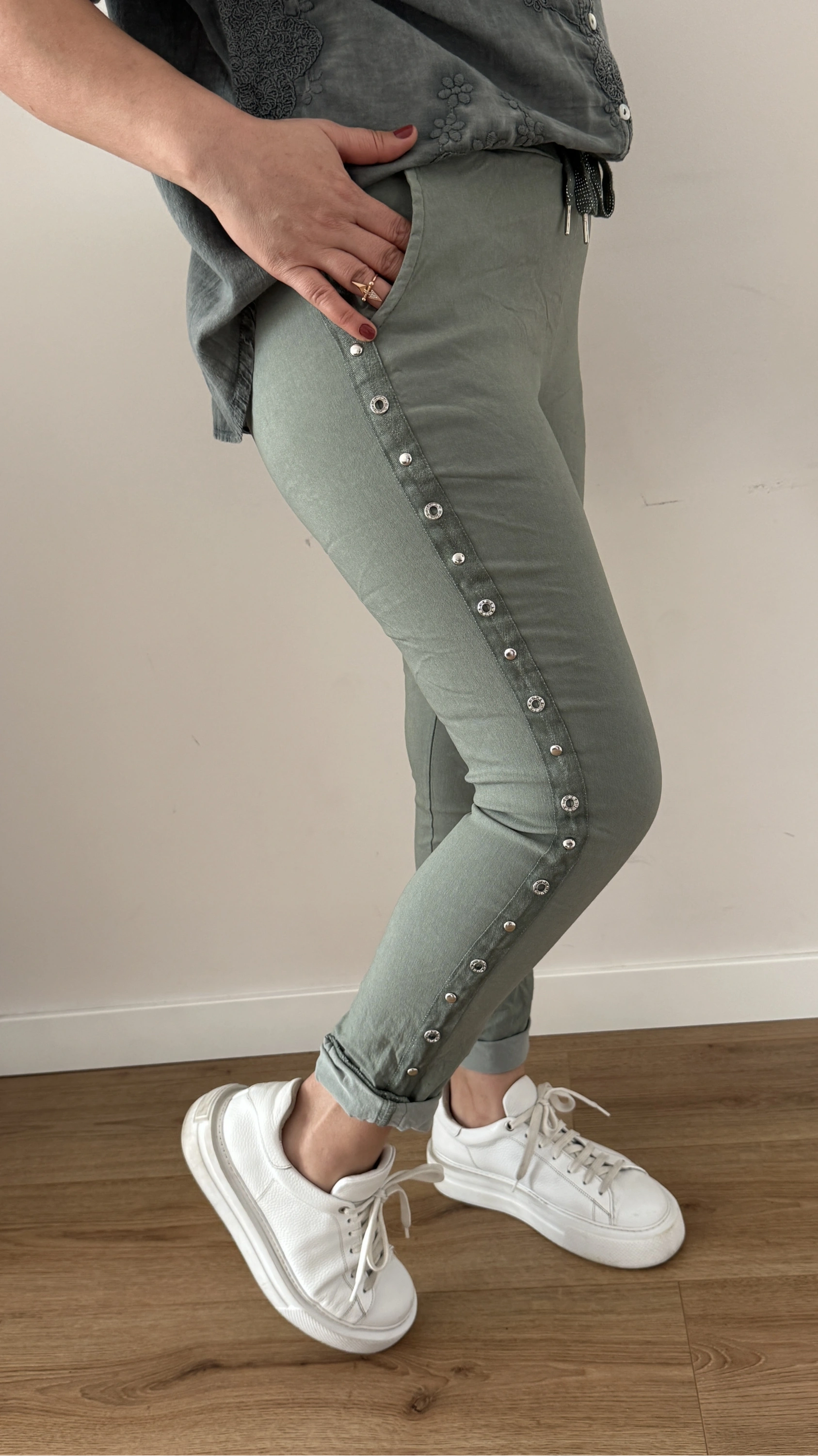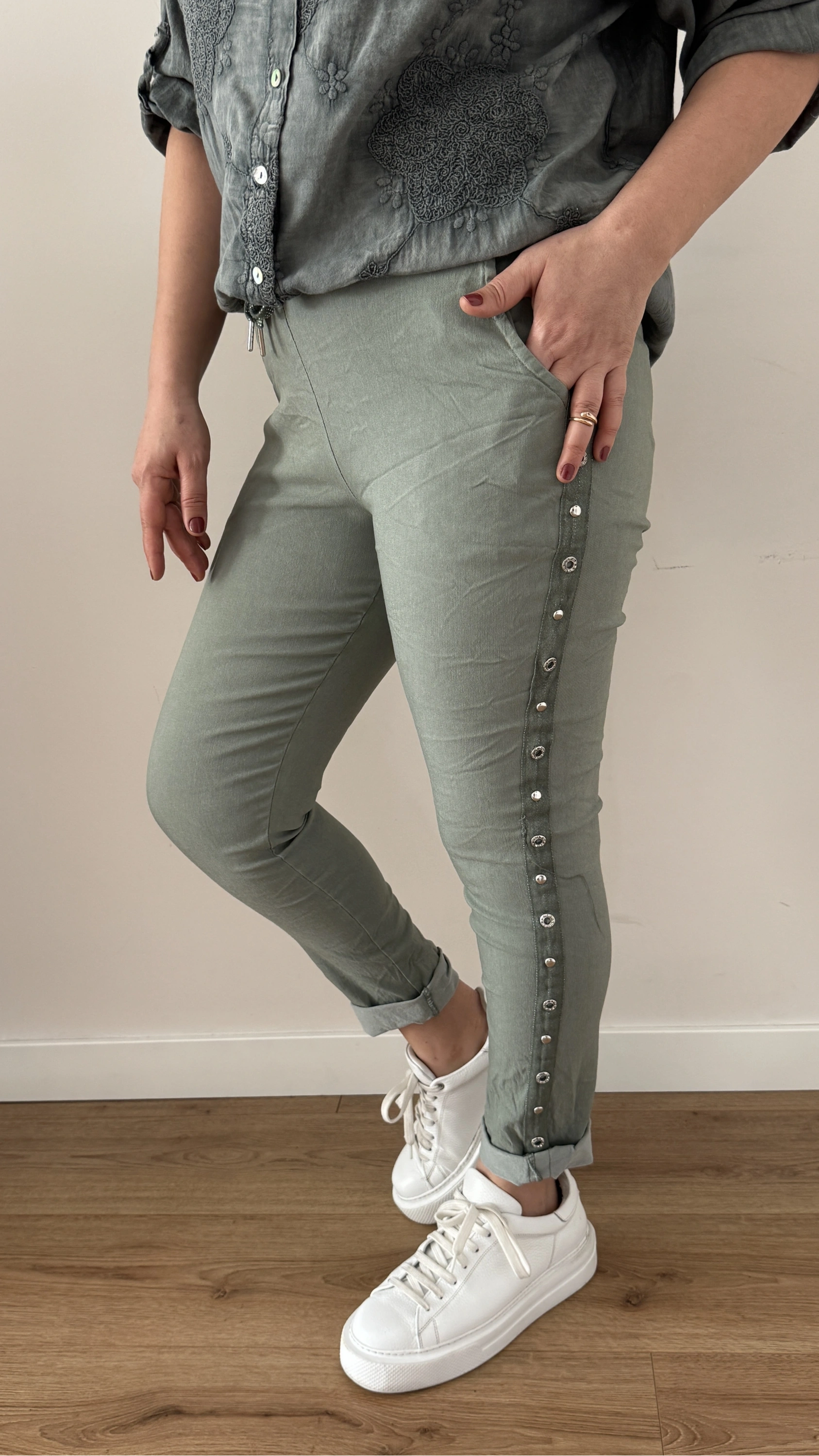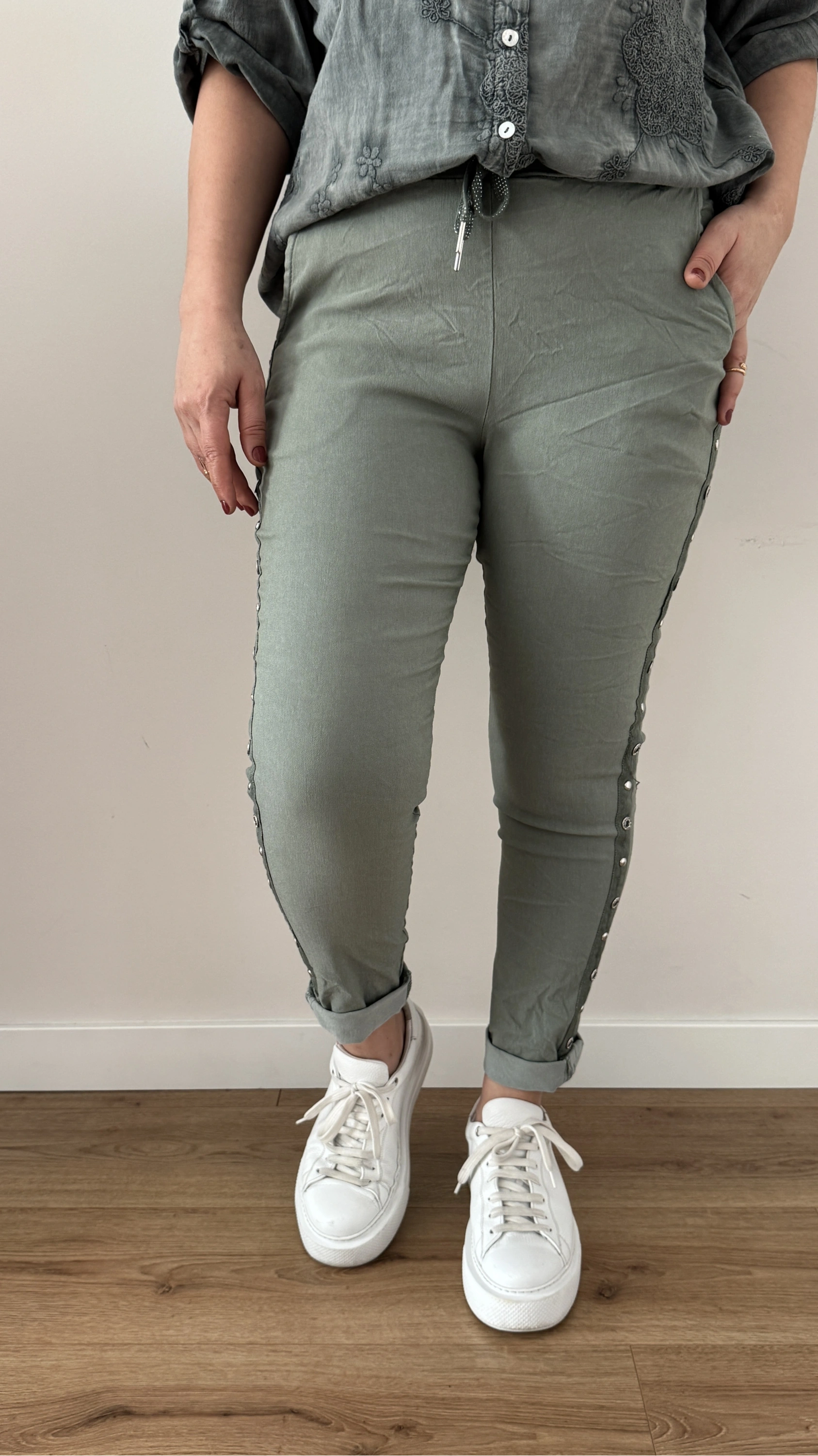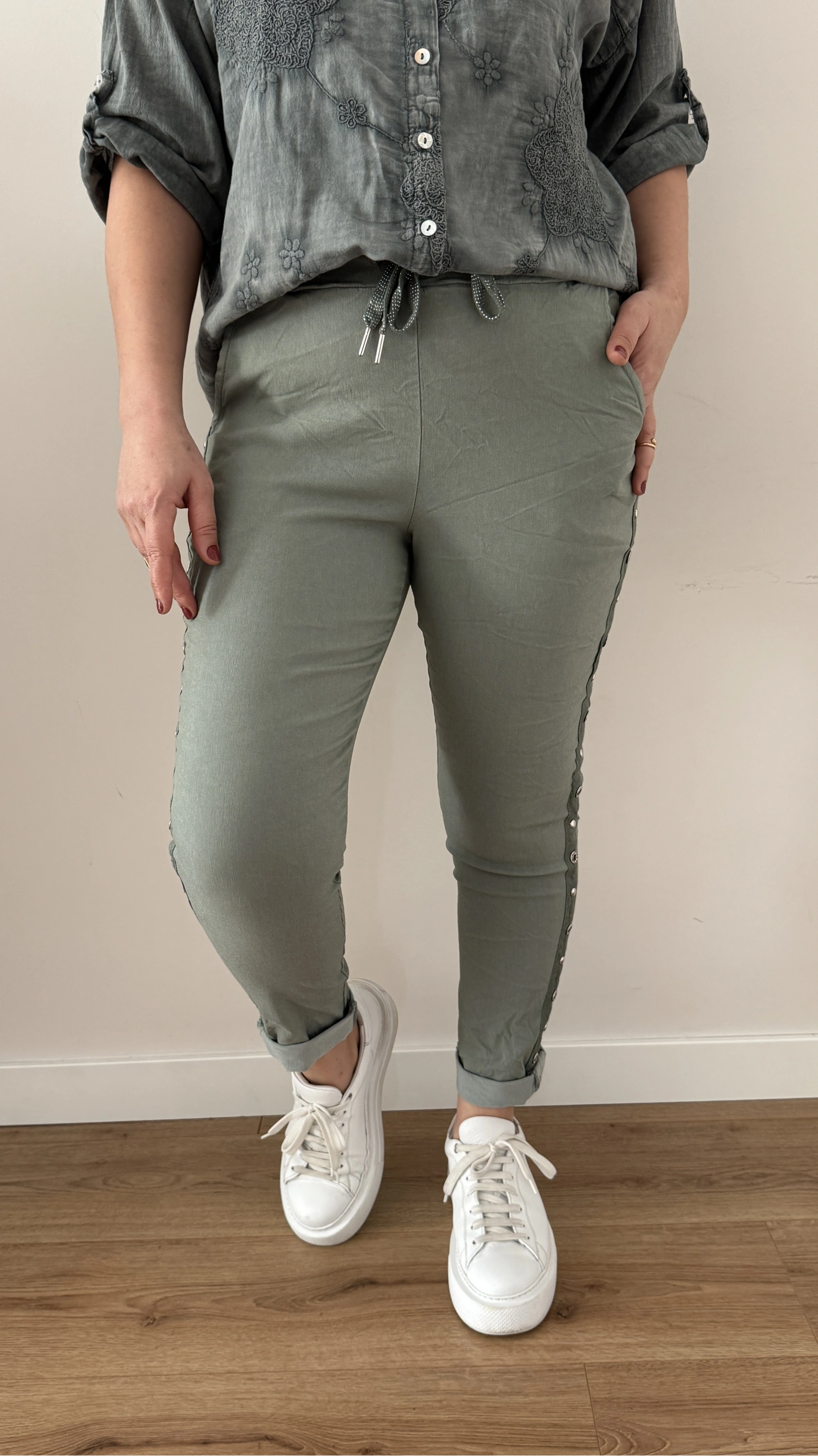 Yanı Zımba Şeritli Haki Yeşil İthal Pantolon
