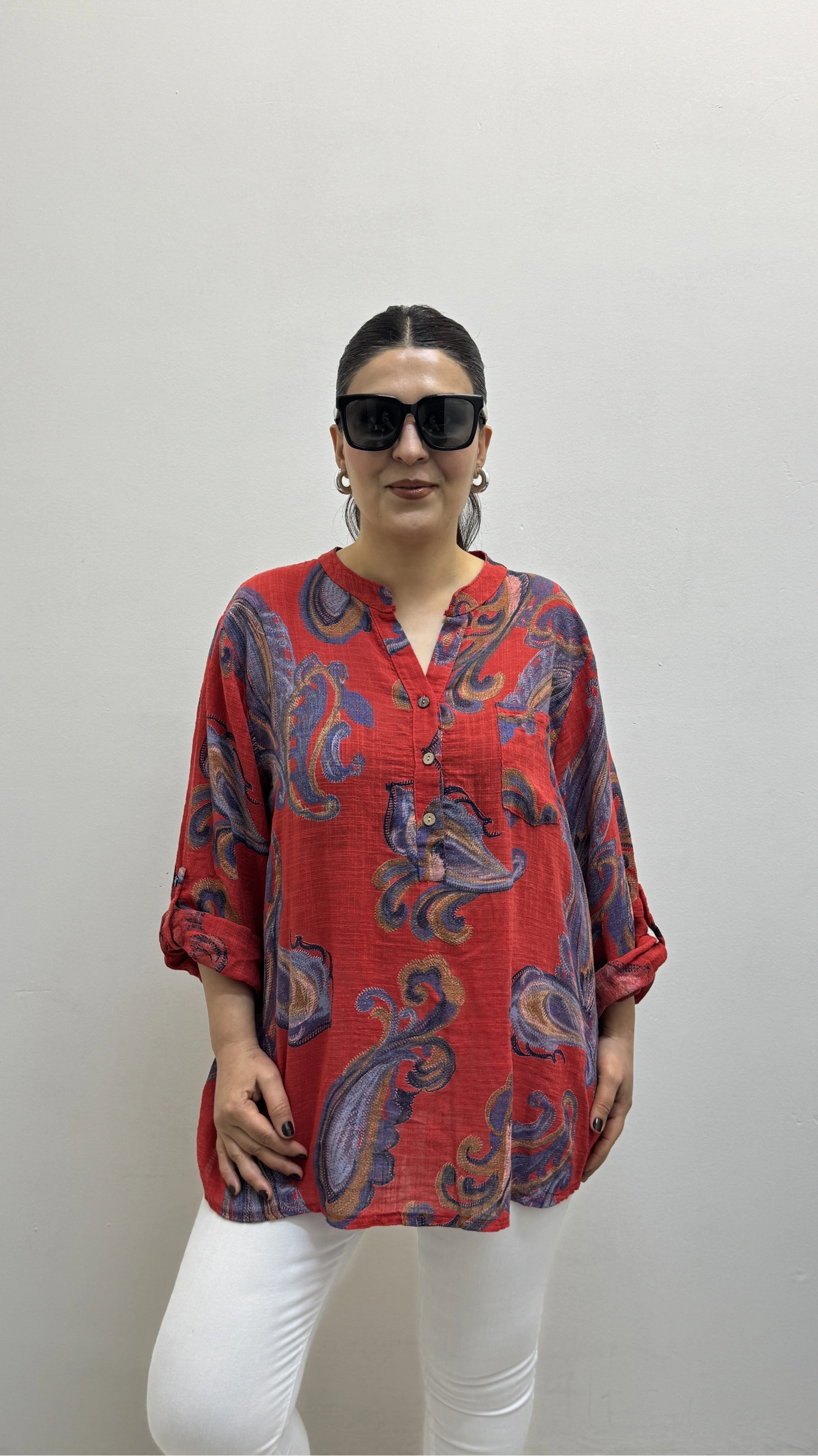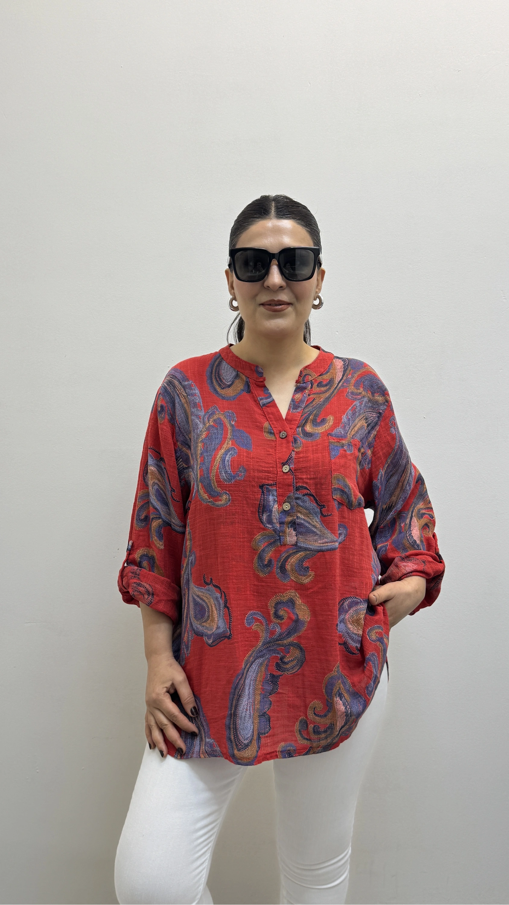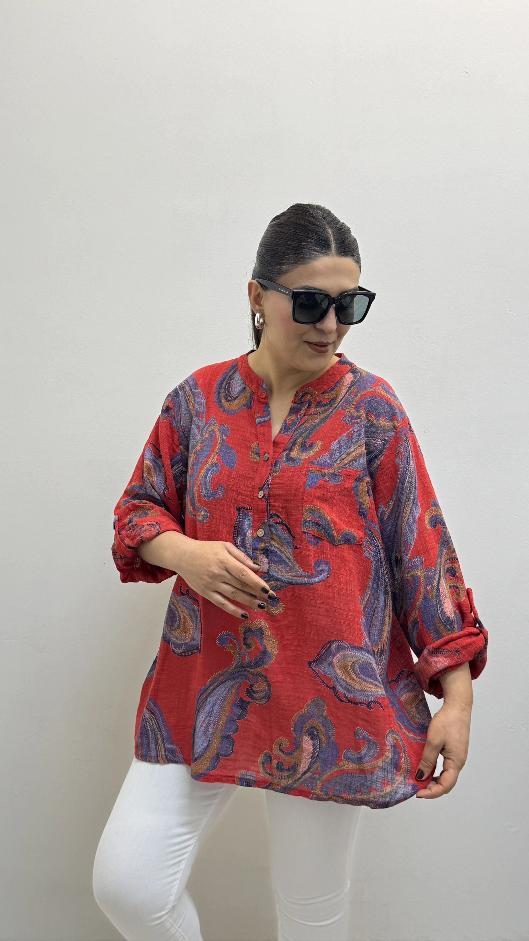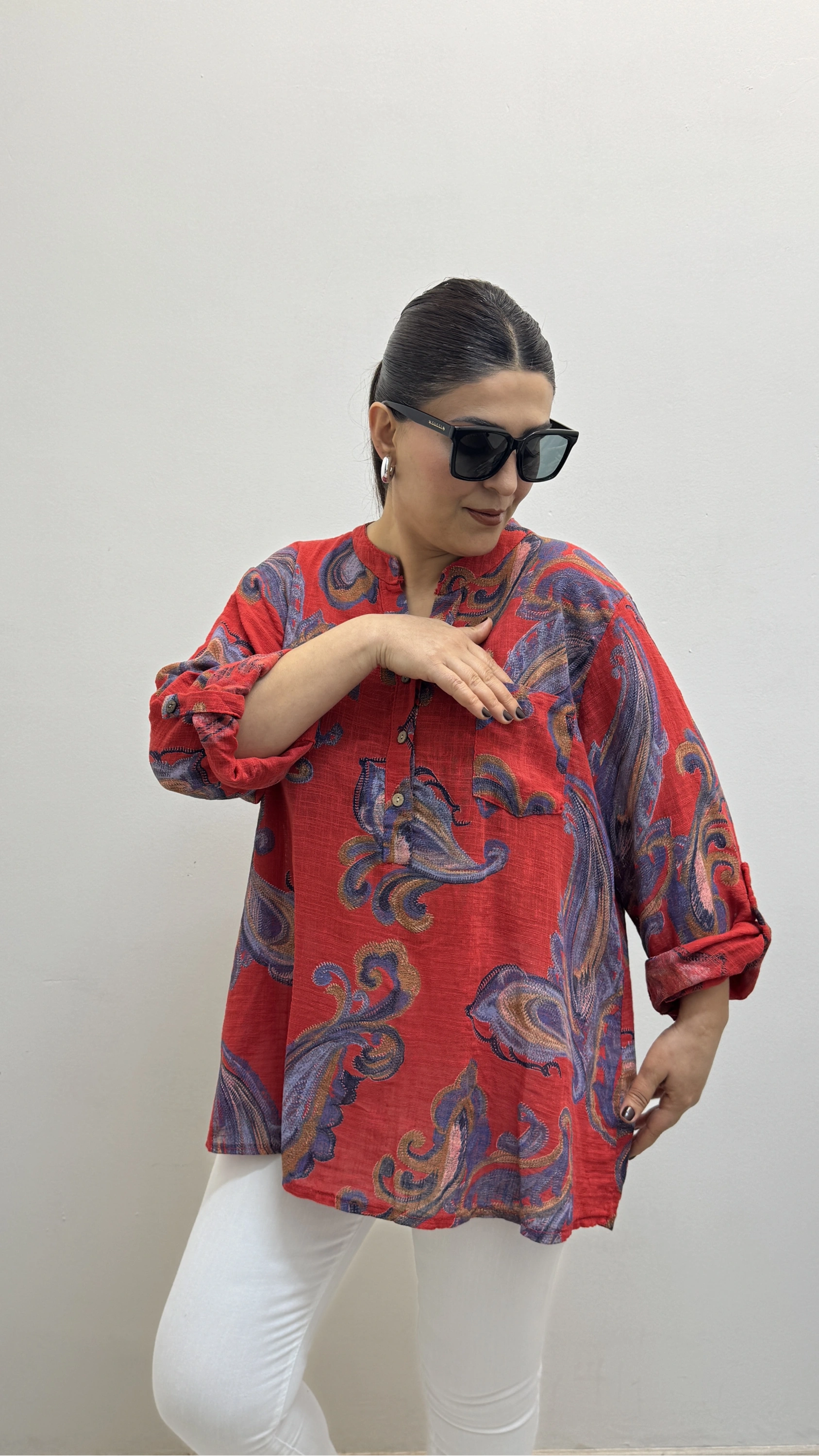 Yaprak Desenli Hakim Yaka Kırmızı İthal Gömlek