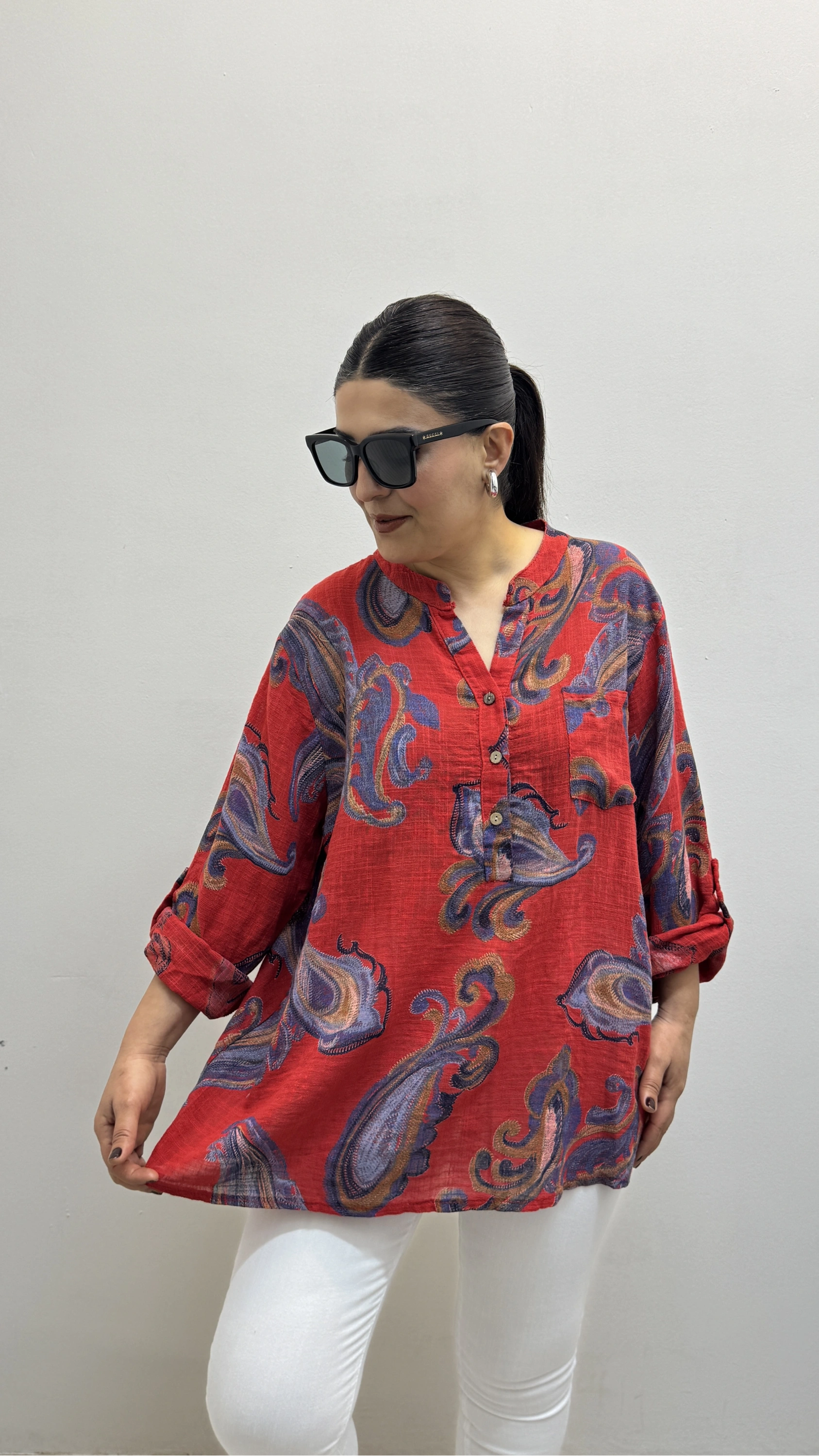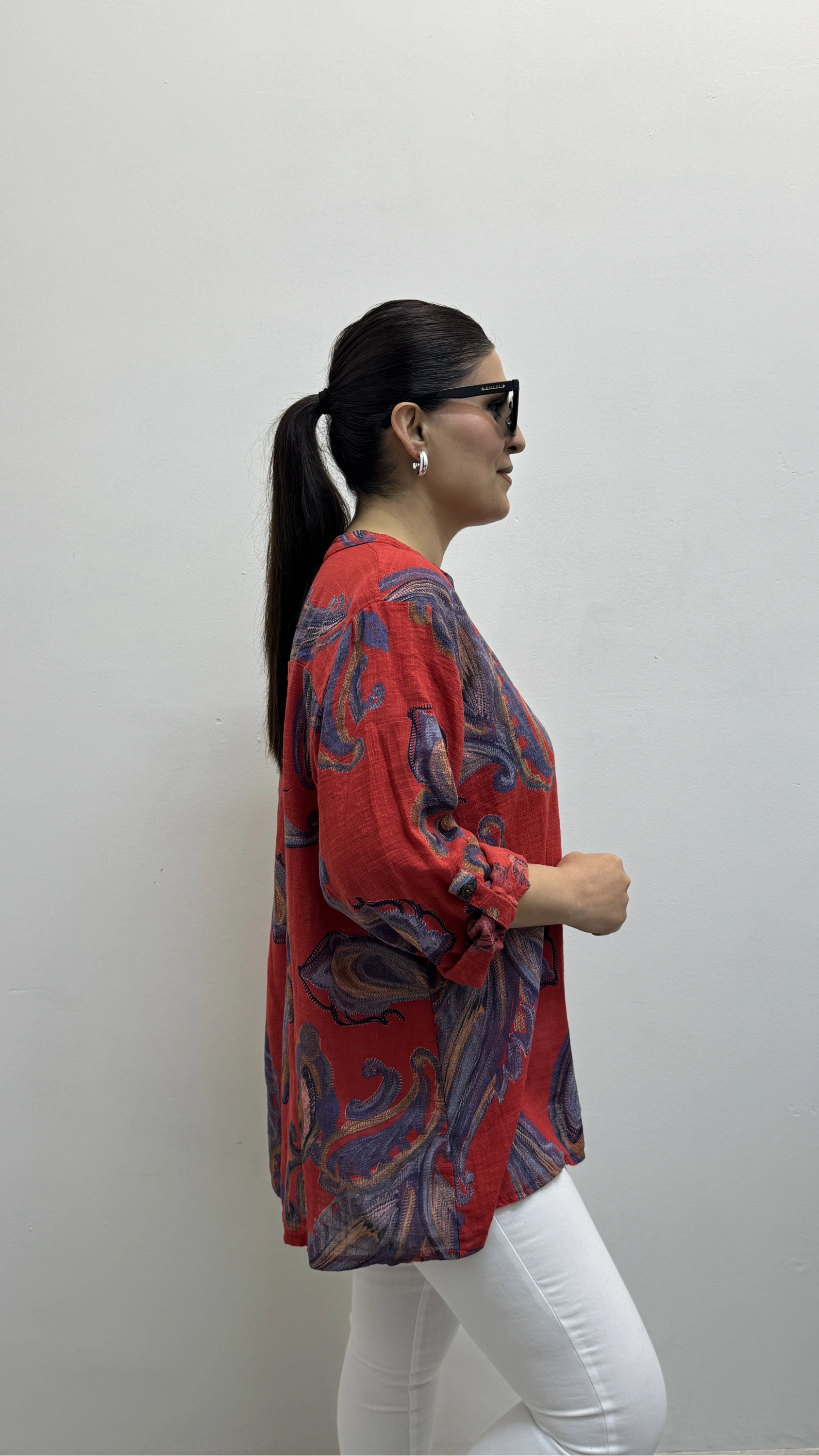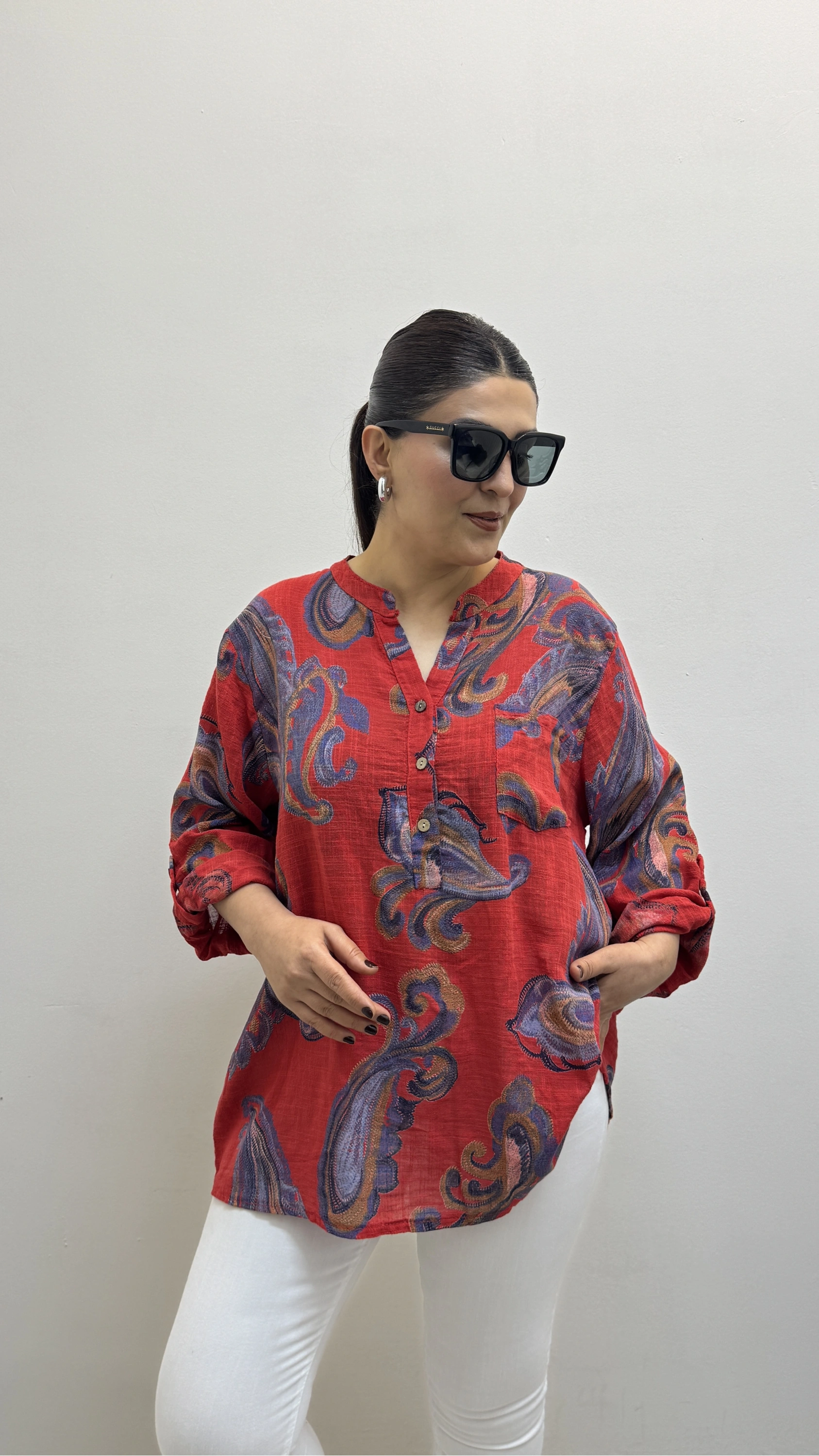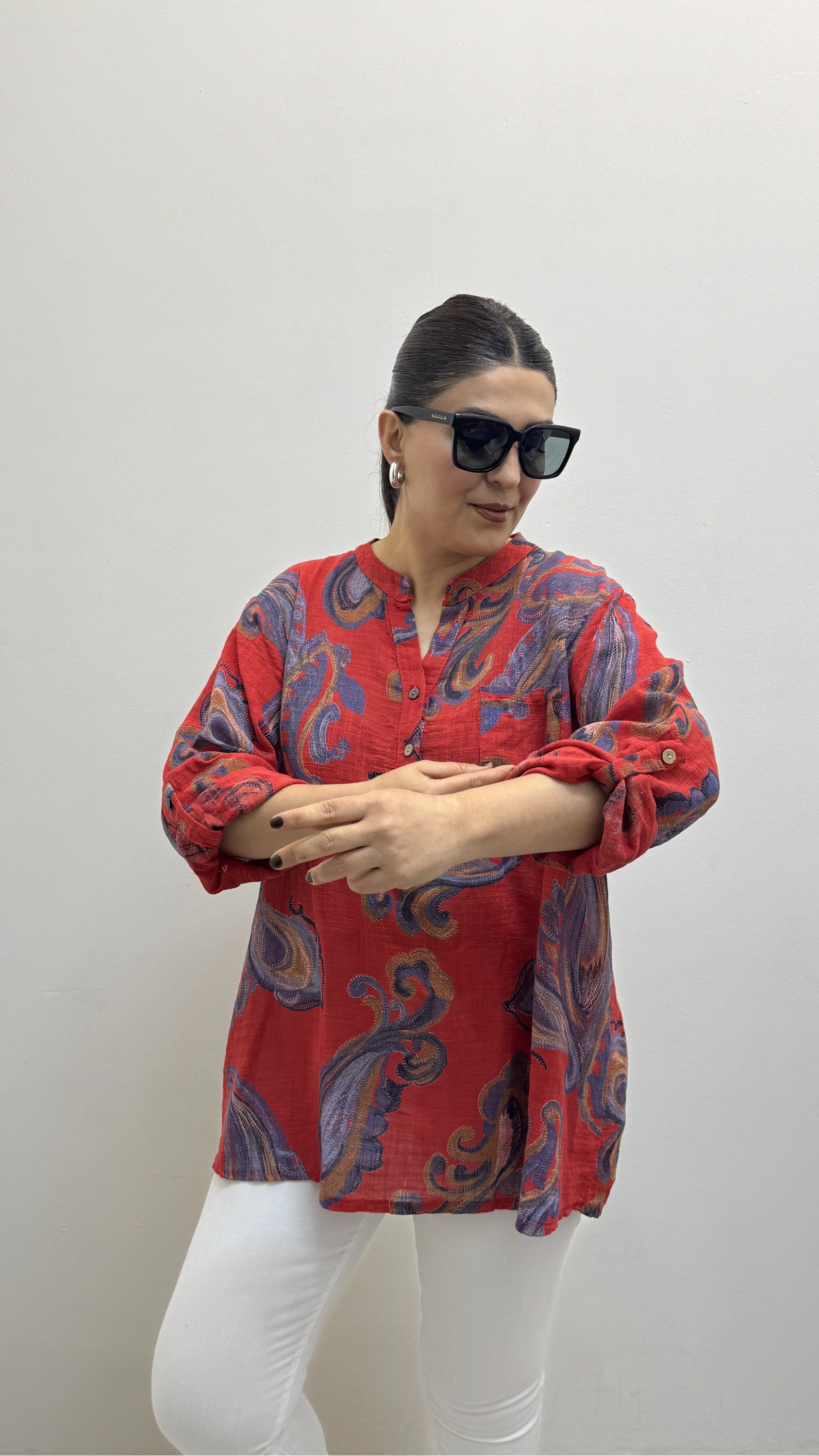 Yaprak Desenli Hakim Yaka Kırmızı İthal Gömlek