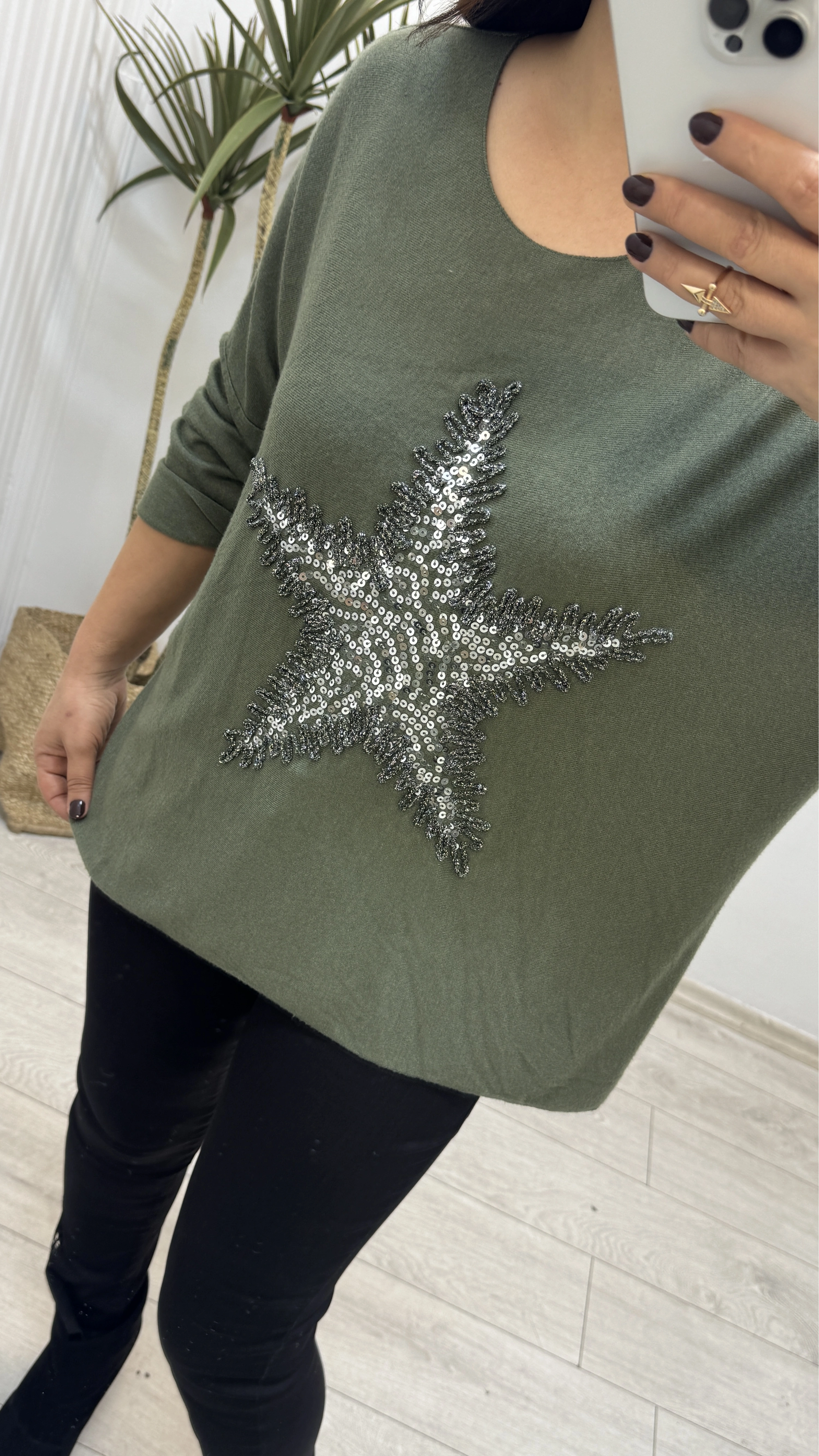 Yıldız Desenli Haki Yeşil İthal Bluz