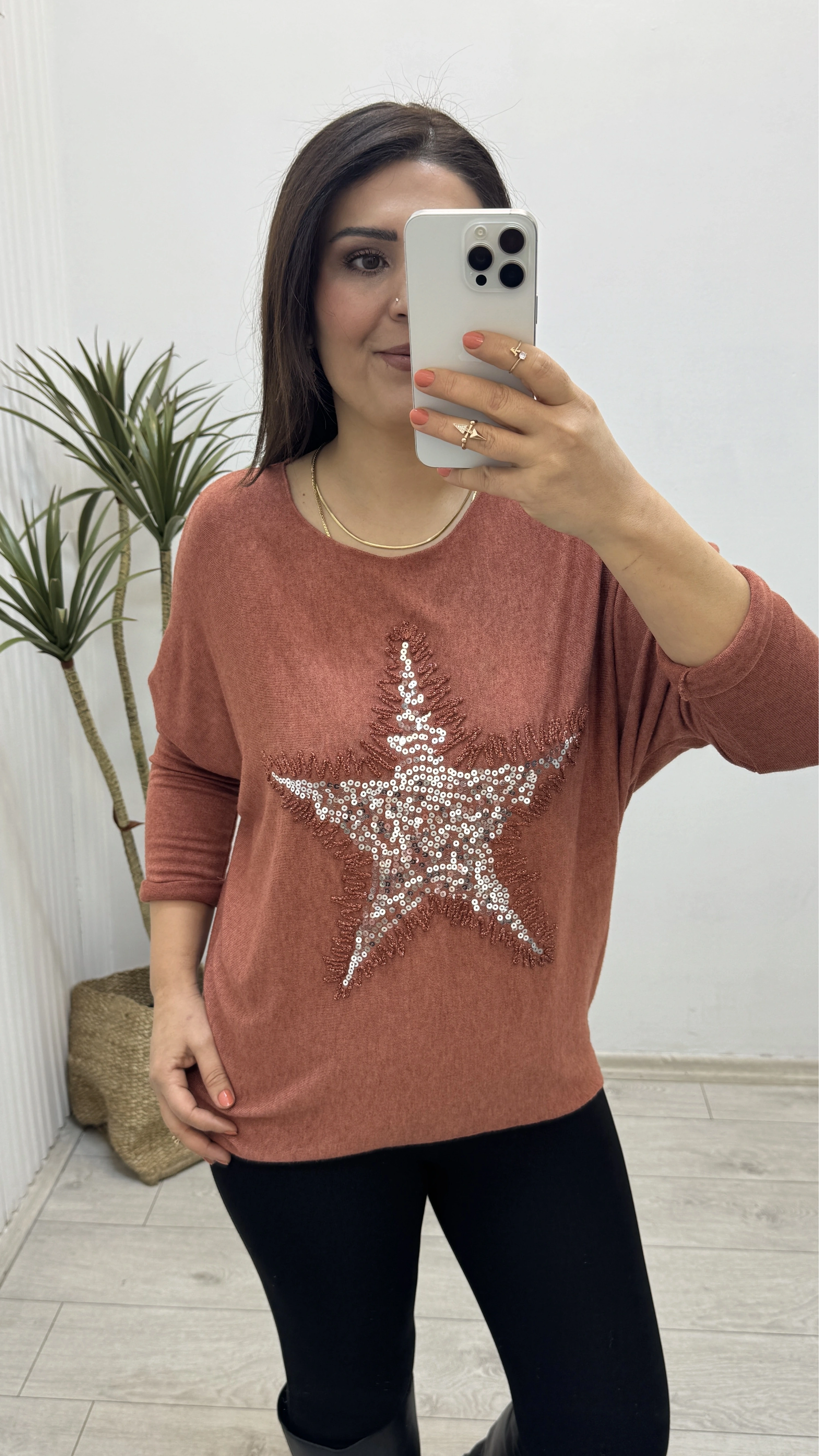 Yıldız Desenli Tarçın Rengi İthal Bluz